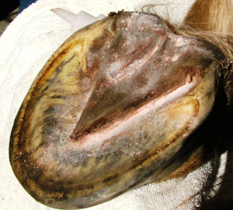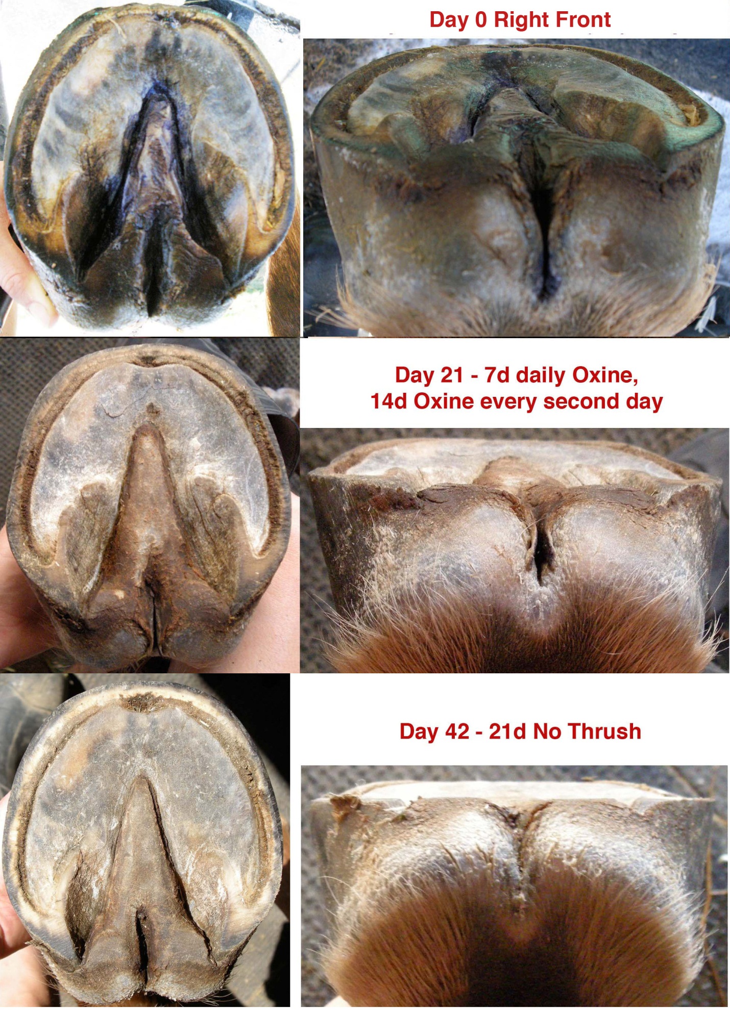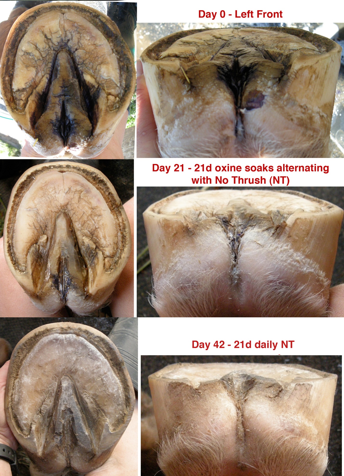 Both of my horses had deep central sulci on their front feet and one had deep central sulci on his hind feet. I was not able to get to the bottom of some holes even with a 1 inch hoof pick. Daily antibiotic treatments worked for a short time but soon became ineffective. 40% bleach was too caustic to the frog and sole. A solution of 0.5% gentian violet and 0.5% iodine was ineffective, as was diluted Lysol spray, 50% vinegar spray or 40% zinc oxide cream. I needed an agent that promoted healing of the frog, and while topical antiseptics kept the surface thrush under control, they were not healing the deeper structures of the hoof. I discovered Oxine AH, and a new product called No Thrush and decided to experiment, first comparing No Thrush with Oxine soaks, and later comparing No Thrush to Thrush Stop.