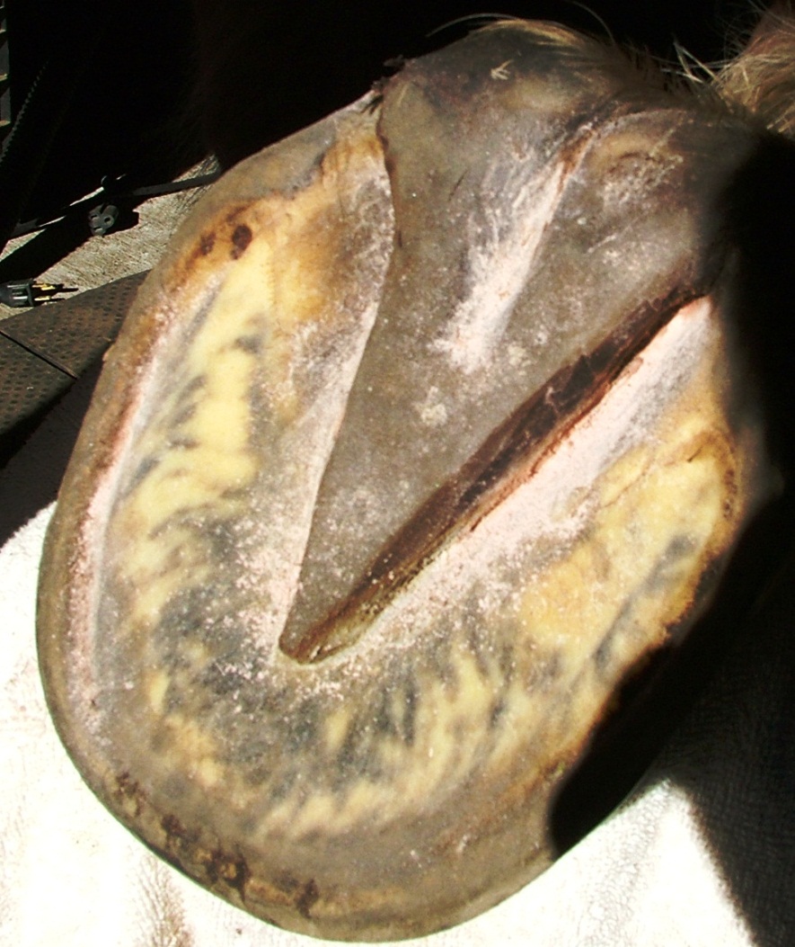 Three weeks of treatment that included daily or every second day of dusting with No Thrush produced frogs that were not sensitive anymore. The depth of the central sulcus was 50% shallower and the frog tissue was overall much firmer with no significant areas of surface thrush/cheesy frog. By comparison, the two Oxine AH soaked frogs were still sensitive to pressure, still had deep central sulci and significant surface thrush. These Oxine soaked feet were treated for a further three weeks with No Thrush daily. The No Thrush produced significant healing, the central sulci grew out and surface thrush was much reduced (Figure 3). One of these feet did not lose sensitivity to pressure deep in the central sulci until 4 weeks after daily No Thrush treatment was initiated (data not shown). The four hind feet varied in their time for healing, based on how deep the central sulci were at the start of the treatments. One hind foot was healed after 19 days of No Thrush treatment (Figure 4), a second took 26 days (Figure 5), while the third (Figure 6) and fourth took 6 1/2 weeks (Figure 7).