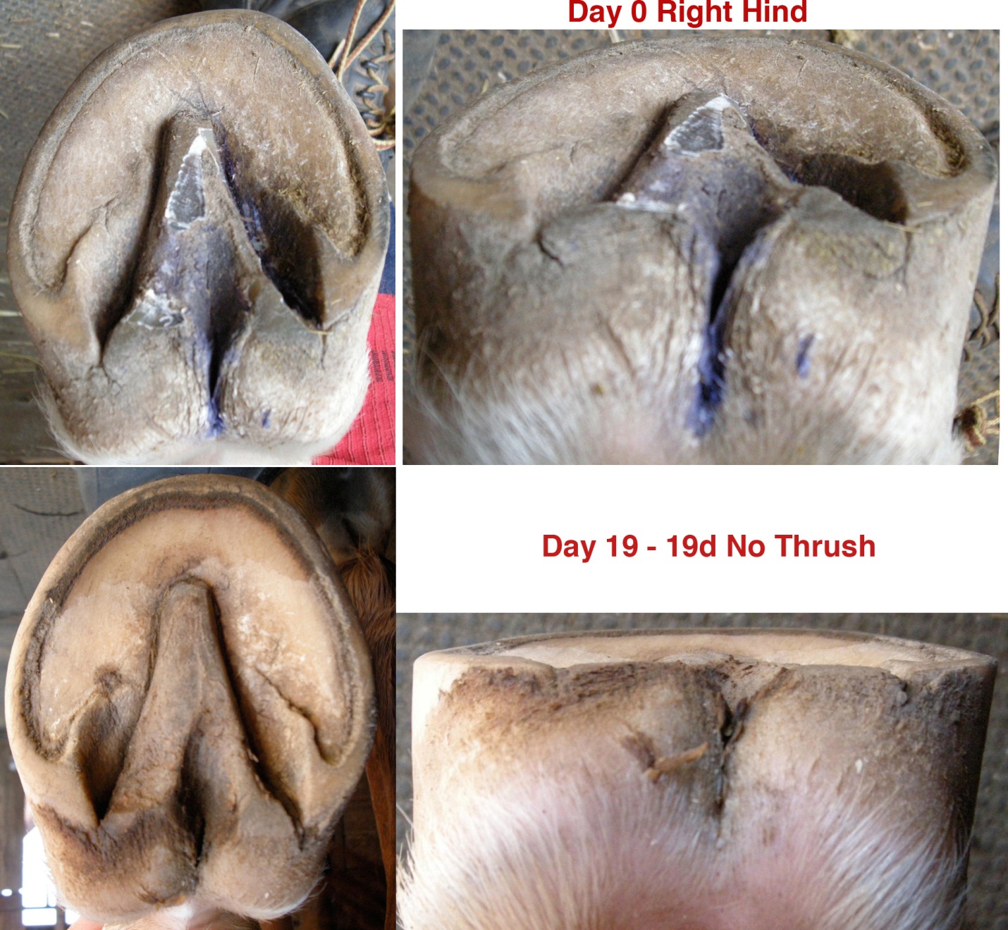 While I believe thrush is caused by accumulation of dirt and manure, for some horses, under certain conditions, even keeping their feet clean twice a day was not enough to prevent reinfection of the frogs. However, the individual hoof susceptibility to infection should also be noted, as I found one hoof (out of n=8), maintained good form with cleaning and debridement alone for 3 weeks, while others degraded before my eyes with the same treatment protocol. The jury is still out as to whether Oxine soaks once a week can prevent thrush better than daily cleaning. Unfortunately I have not compared Thrush Stop to No Thrush on frogs with very deep central sulci to examine the rate of healing from each. While my preliminary results would indicate that Thrush Stop should be as effective as No Thrush to heal chronic central sulcus thrush, this remains to be established.