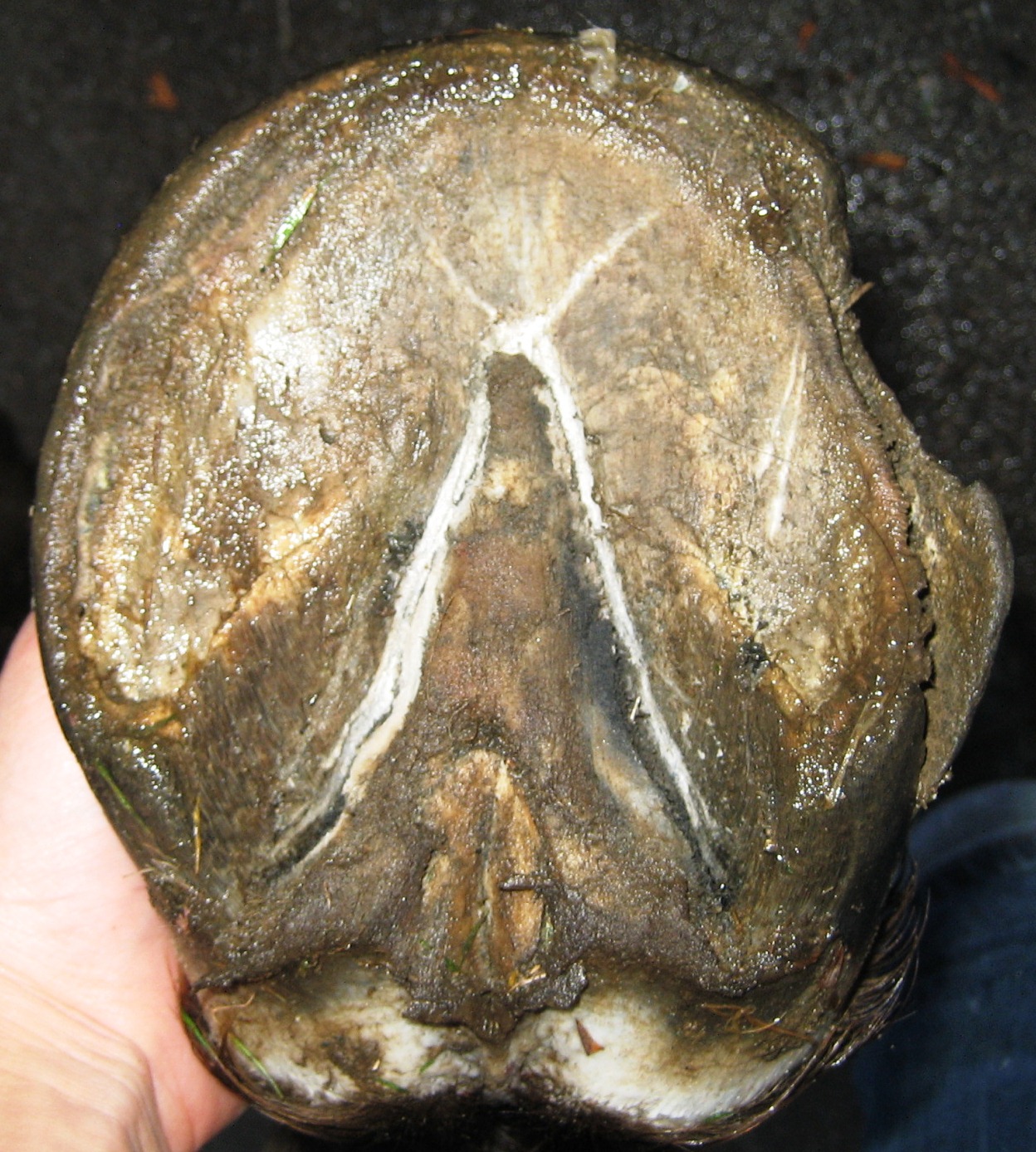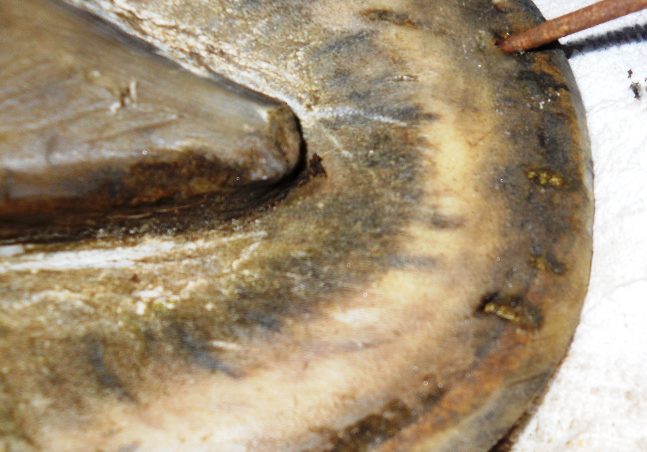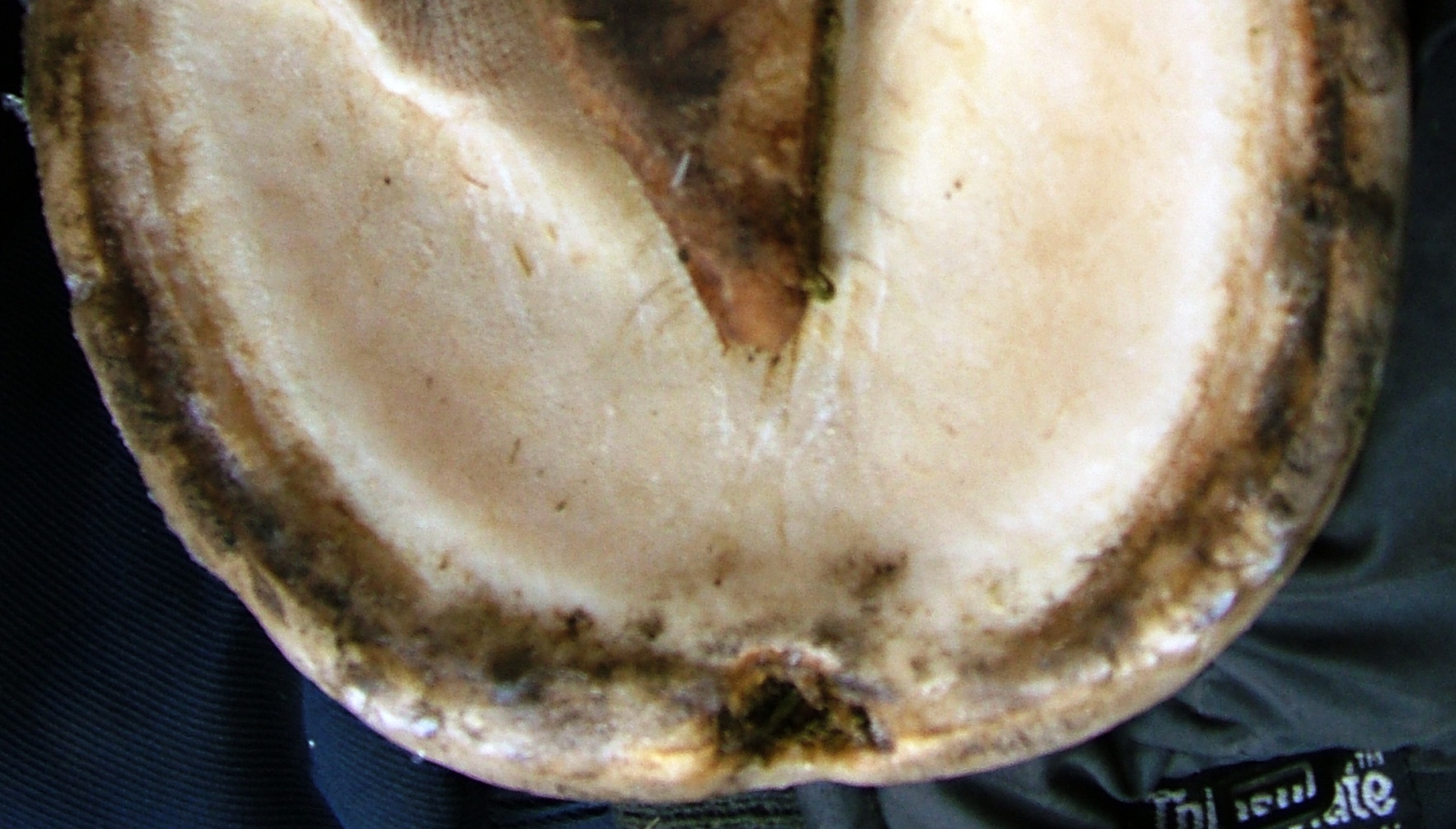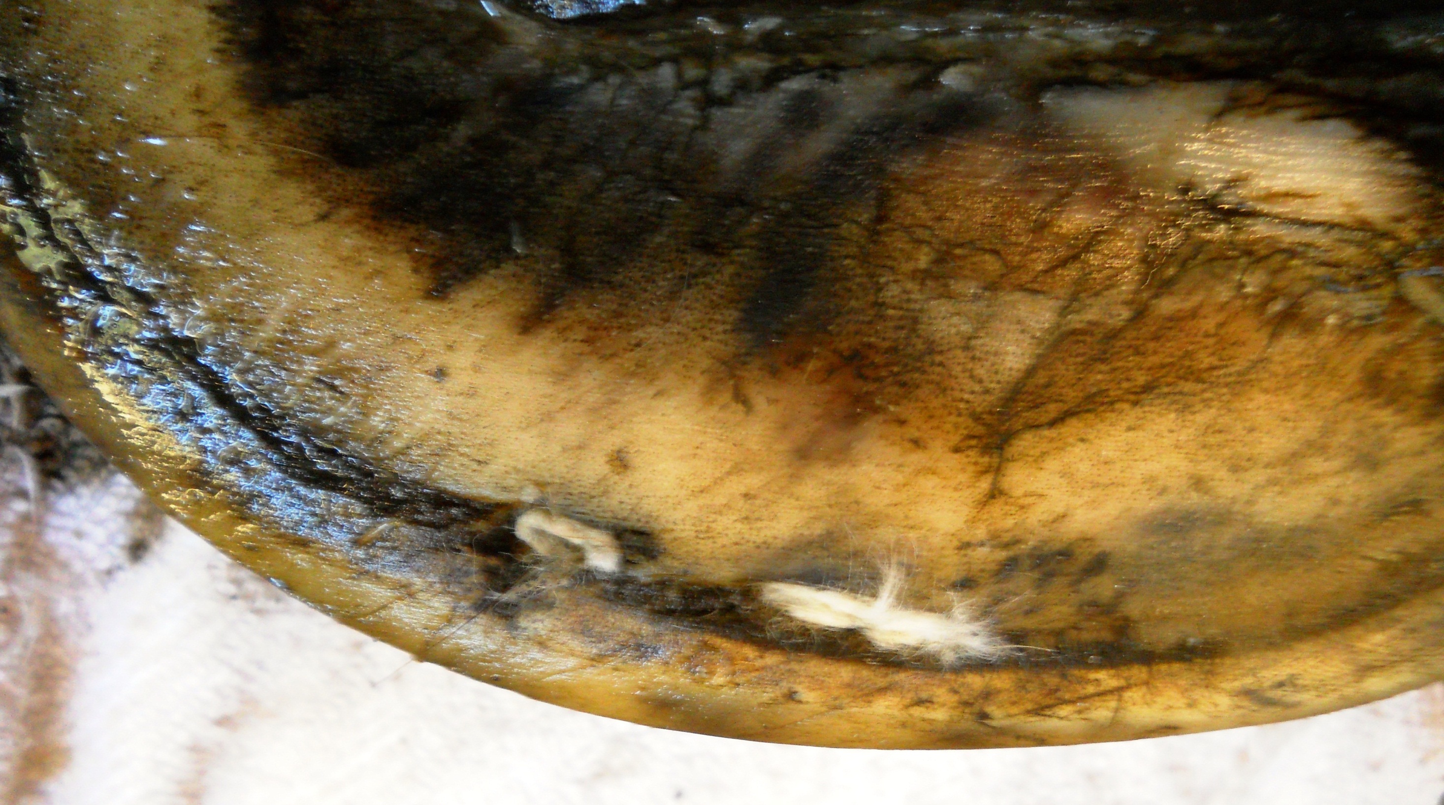 According to my observations, inner hoof wall infections seem to present in 2 major ways; as holes and as cracks of varying length and severity running either vertical or parallel to the white line.