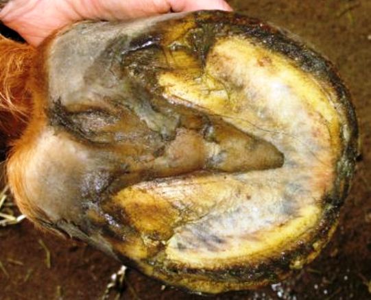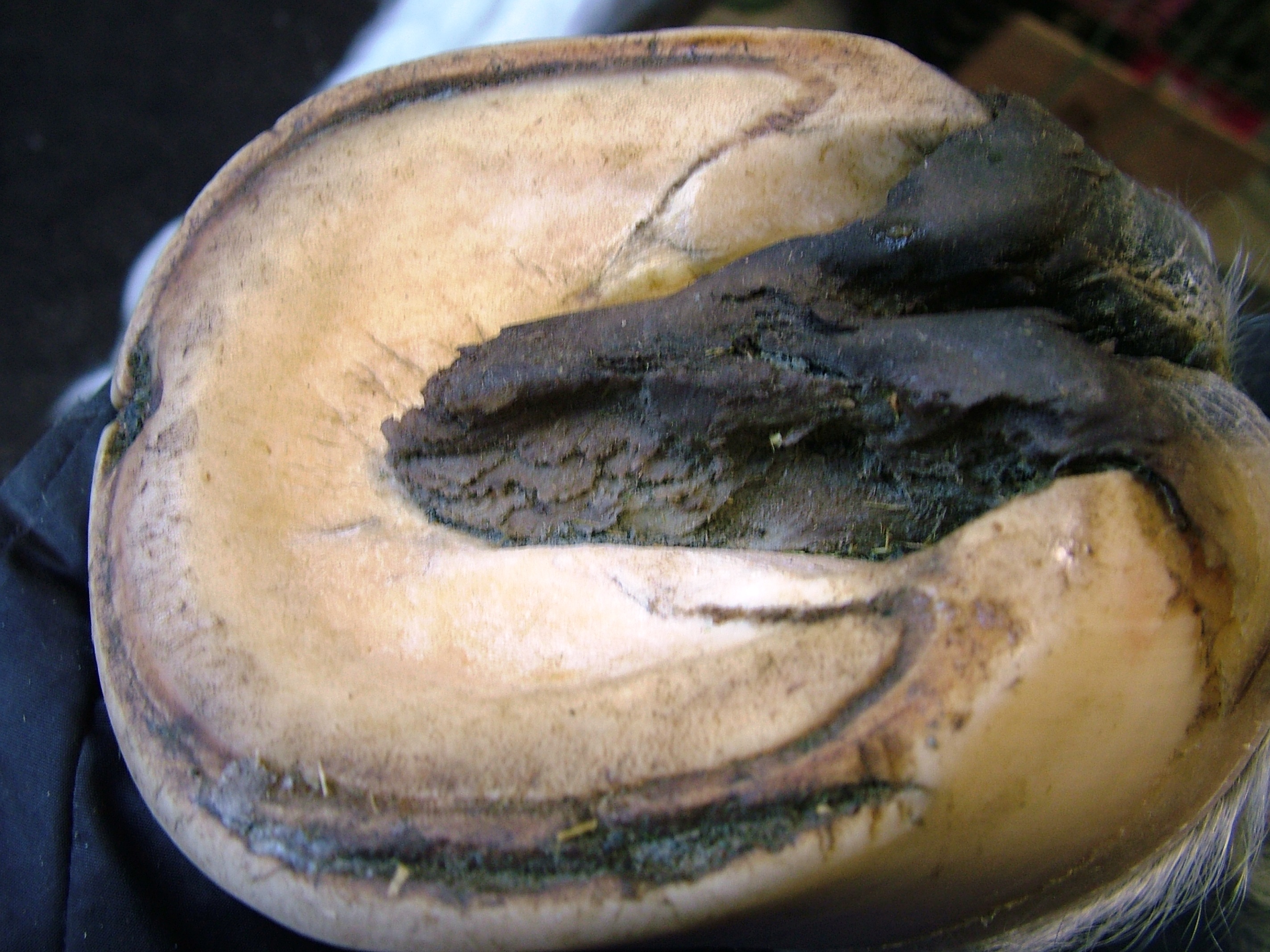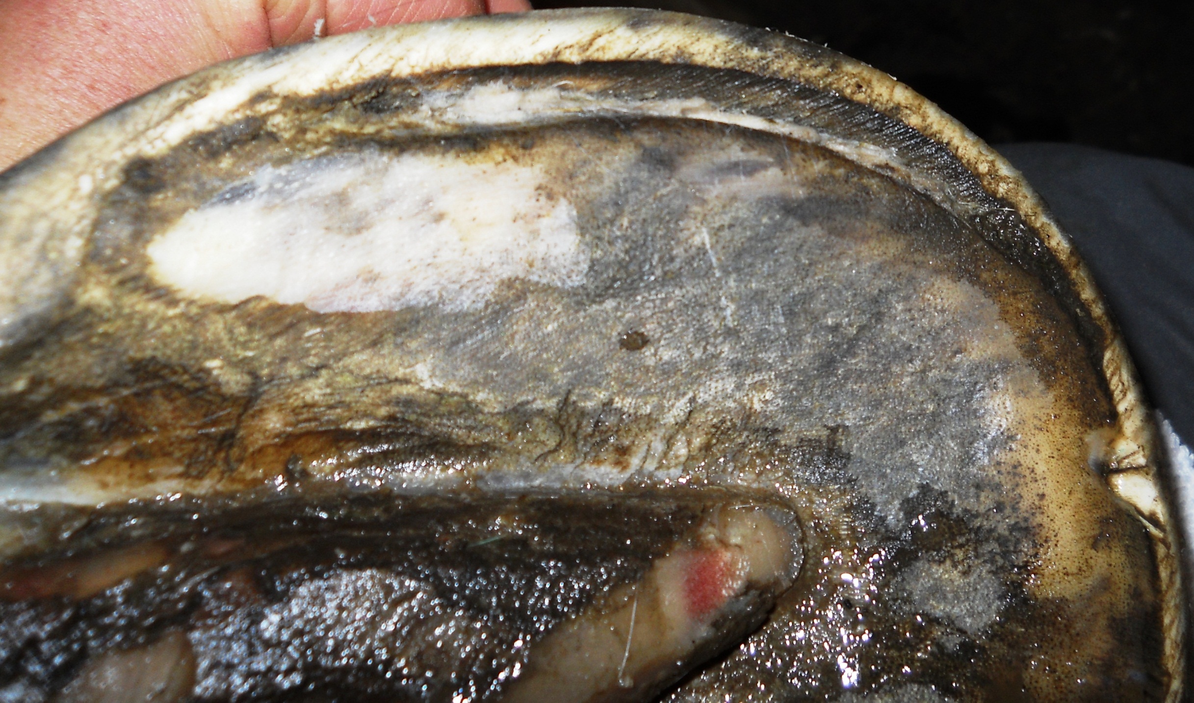 Fungal and bacterial infections in horses’ hooves are not limited to the softer frog horn. The inner hoof wall is also very susceptible to infection, and if these insults are not detected and treated in a timely manner they can lead to huge problems. In its later and very visible stages, such infection is commonly (and wrongly) called White Line Disease. Usually large areas of the inner hoof wall have been damaged by that time, and the horse is showing signs of lameness. Fig. 1 shows such a scenario.