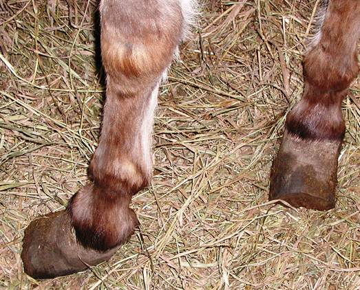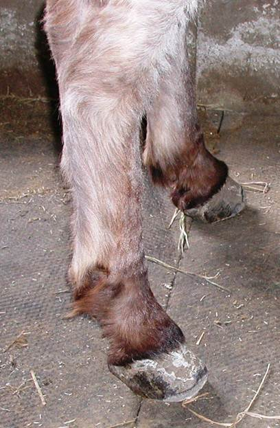Right hind This is Cody in his elf shoes. Unfortunately it is his real foot and a very serious situation. I am proud to say that this foot was back to normal looking in a short time. Again, I worked on the back feet together for a couple minutes at a time to keep Cody from having to stand on a foot for very long. It worked out well. In this photo you can see where a previous farrier attempted a trim but realized it was too much for them and stopped.