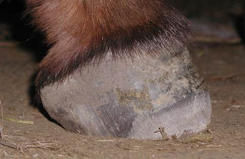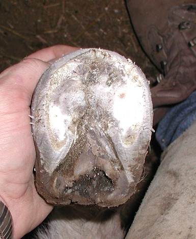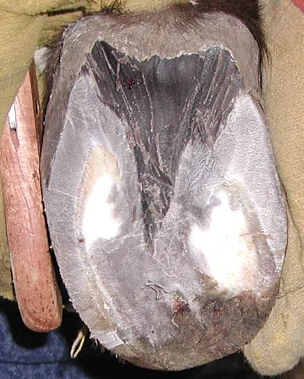 This photo was taken of the underside of the right front foot 4 days after I trimmed the foot. During the initial trim, I found that the coffin bone had partially penetrated the sole. I was concerned about this and checked Cody for soundness after I finished his trim. He walked fine and did not favor the right front foot so I left him barefoot. I asked the owner to watch this foot carefully. I went back 4 days later to check on Cody and examine the coffin bone penetration. I was surprised but very happy to see how much the sole had already healed over this area where the penetration had occurred. Another thing you can notice in this photo is that there are still no real collateral grooves. It took me several trims to really get those grooves open and back in shape.