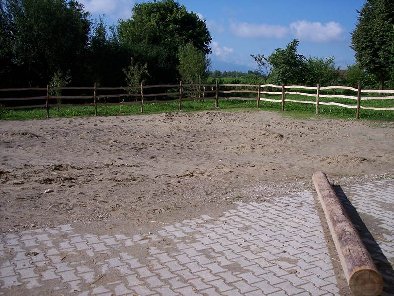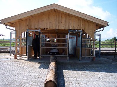 This picture shows the double gated entrance to the horse area. In the foreground on the right is the wash area. In the background one can see a hay feeding station.
