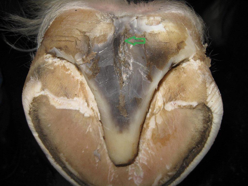 Trimming and debridement of affected tissue is the cornerstone of treating frog disease. This process must be continued long enough to remove all diseased tissue (which may be days or weeks) and frequently enough to remove compromised horn as it grows out before the disease process has a chance to extend deeper into the frog. Initial treatment involves the removal of as much diseased tissue as possible without invading the live frog plane. The image in Fig. 36 may be helpful to understanding the anatomy of this area. As a general guideline, removal of compromised horn should not cause pain, lameness or bleeding. If in doubt, err on the side of being conservative. The frog grows quickly and it is better to remove tissue gradually over several days than to risk further damage to the frog by overzealous trimming. Fig. 36. Photo courtesy of Jenny Edwards (http://www.all-natural-horse-care.com/)