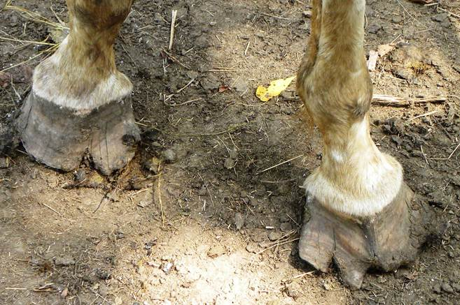 Here are the hooves a couple hours later after the trim. I was able to remove the majority of the nasty splits and disconnected wall material. I was able to rasp out much of the flared wall. I trimmed Mr. T. very aggressively taking as much material as I could, yet leaving enough material around the toe and sole to support his weight while standing and help protect the thin sole. With the number of very severe splits and the degree of lamellar separation, I did not want to leave any material that might continue to pull apart the hoof wall. He did very well after the trim.