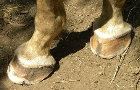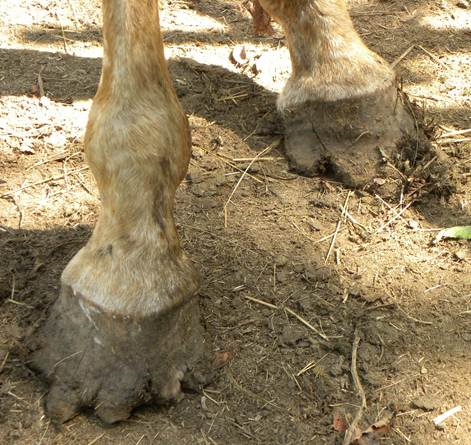 Here is Mr. T. in February 2012. This is almost 2 years later. His splits are gone, he has a few new smaller cracks and some superficial cracks that are not causing any problems plus a couple chips in the walls from the many acres of rocky pasture he runs on. Most of this is due to the extremely dry winter we have had here in Kansas this year. There has been little moisture and horse and burro hooves in this area are dry, hard and brittle. I want to point out the nasty split he had in his right front hoof when I started trimming him. It is gone. The spot you see at the bottom of the toe is the remains of an abscess that developed probably from his hoof smacking a rock. It is dried up and healed but there is a weak spot in the hoof wall and when I was trimming him this day a piece broke out leaving the spot you see. When I first trimmed Mr. T., I did not know if that split would heal because it extended into the cornet band. I am very pleased that it has healed completely. Mr. T. is in good shape and very friendly. When he first arrived at L and G's place, he was underweight along with his bad feet. I have continued to trim Mr. T., well until just recently. Mr. T. has gone to a new home. L and G were keeping him until his hooves had recovered and until just the right person came along to adopt him. That happened in April 2012 so Mr. T. has a new young lady taking care of him. Mr. T. is a case that everyone should take to heart. His life was nearly cut short, first by slaughter then simply due to neglected hooves. I have had three cases recently in which an owner was told by a farrier that the hooves could not be repaired. I am not a professional farrier, I do not do this for a living. I learned to trim hooves because I wanted to know more about hooves and hoof internal structure. Plus I have 14 equines of my own, mostly mustangs, so it was financially smart for me to learn to take care of my own. I just want people to understand that hooves can be rehabbed and neglected hooves is not a reason to put an animal down. If you are reading this and you know an owner out there that has a horse or burro with bad feet and they have been told it's hopeless, reassure them it is not, they just need to locate the right natural hoof-hoof care practitioner. I would like to say thank you to the person who rescued Mr. T. from slaughter and to L and G for their dedication in saving Mr. T. the second time and seeing his hoof rehab through. And a big thanks to Mr. T. for sharing his feet with me and teaching more than I knew before. I'll miss taking care of your feet big guy. |