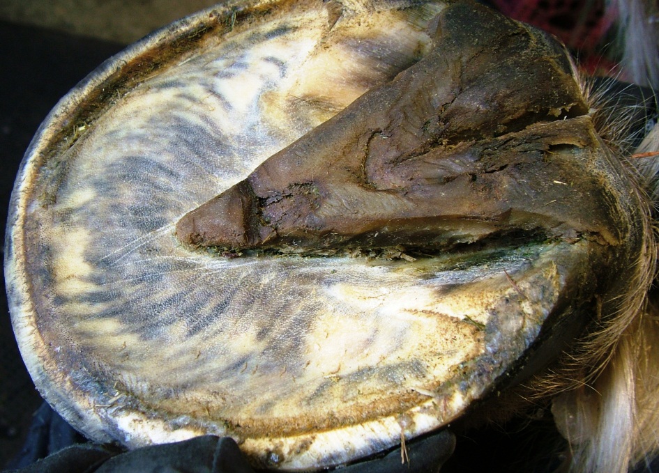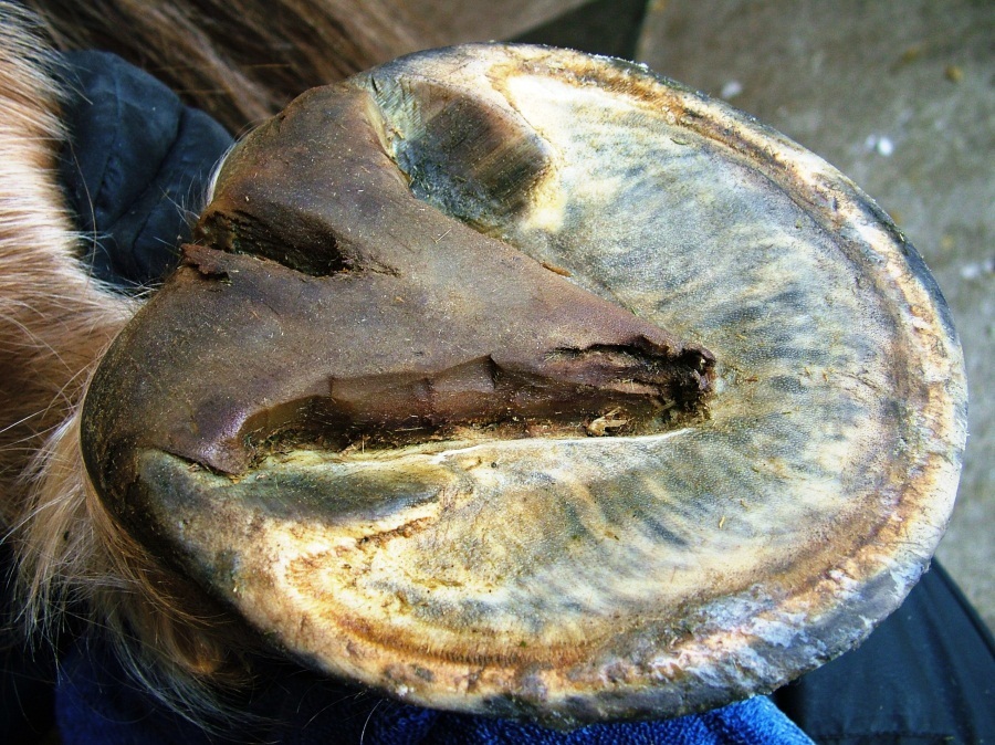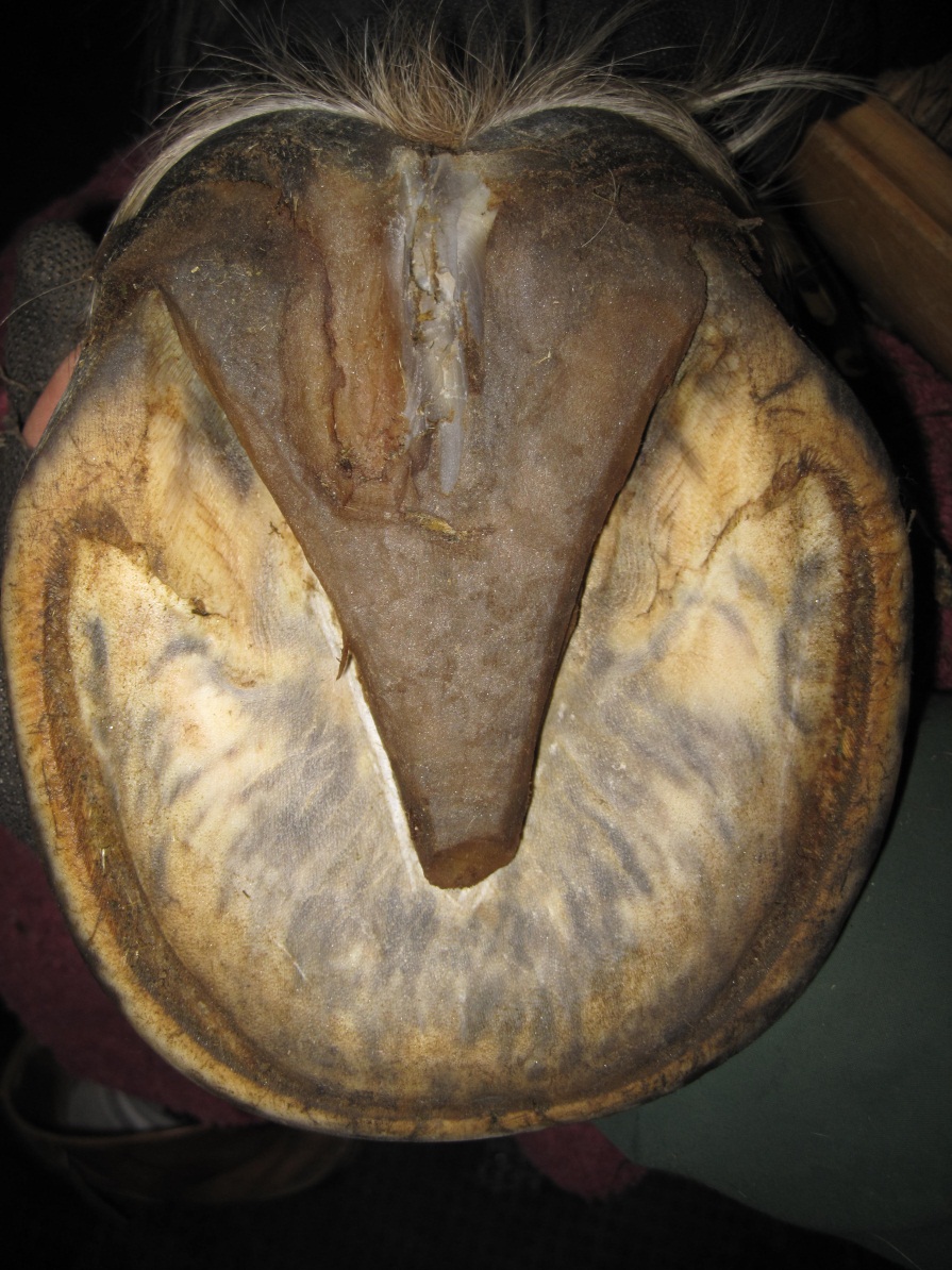 I found No Thrush to be more effective than Oxine soaks for healing chronic central sulcus thrush and treating surface patches of thrush. In retrospect, my eight months of treatment prior to initiating this series of experiments failed to work effectively partly because I wasn’t cleaning and debriding the frog appropriately to expose pockets of infected material and prevent accumulation of manure and dirt, and partly because my treatment solutions couldn’t treat the central sulcus thrush and promote healthy growth as effectively as No Thrush. I found that individual horses kept in the same conditions (stall plus a 30ft yard) can differ quite dramatically in how clean they keep their feet, which in turn affects how fast their frogs start degrading if not cleaned and treated daily. Just 12 hours of being packed with manure can precipitate degradation of solid frog tissue into white, crumby and smelly tissue.