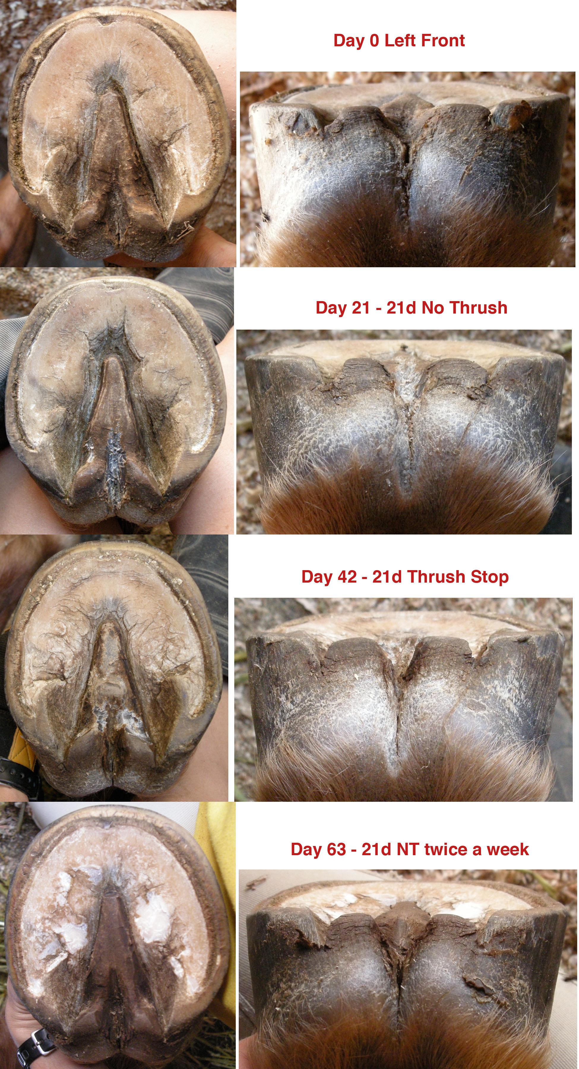 Photographs were taken on Day 1 (the start of the soaking treatments or NT treatments), Day 8, Day 15 and Day 22. All 8 feet were then treated for 21 days with No Thrush alone, using the methods described above, and photographed on Day 43. Hooves treated with NT alone were started 5 days before the soaking comparisons so their final picture was taken on day 48.