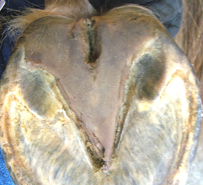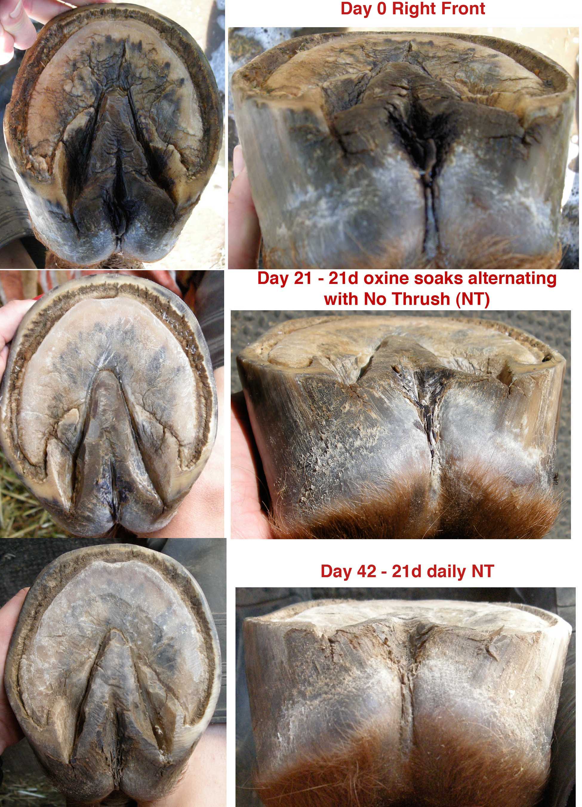 Both of my horses had deep central sulci on their front feet and one had deep central sulci on his hind feet. I was not able to get to the bottom of some holes even with a 1 inch hoof pick. Daily antibiotic treatments worked for a short time but soon became ineffective. 40% bleach was too caustic to the frog and sole. A solution of 0.5% gentian violet and 0.5% iodine was ineffective, as was diluted Lysol spray, 50% vinegar spray or 40% zinc oxide cream. I needed an agent that promoted healing of the frog, and while topical antiseptics kept the surface thrush under control, they were not healing the deeper structures of the hoof. I discovered Oxine AH, and a new product called No Thrush and decided to experiment, first comparing No Thrush with Oxine soaks, and later comparing No Thrush to Thrush Stop.
