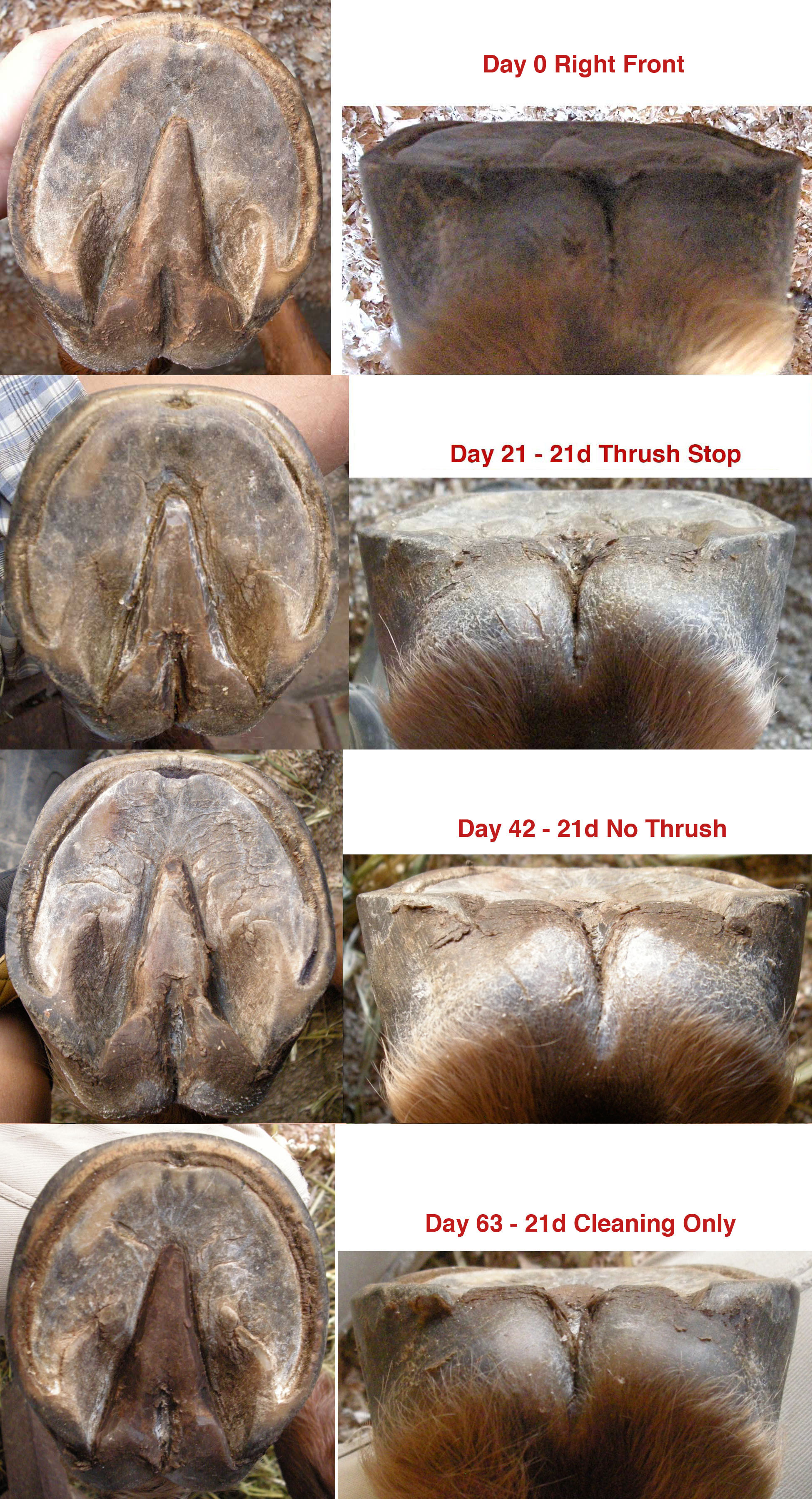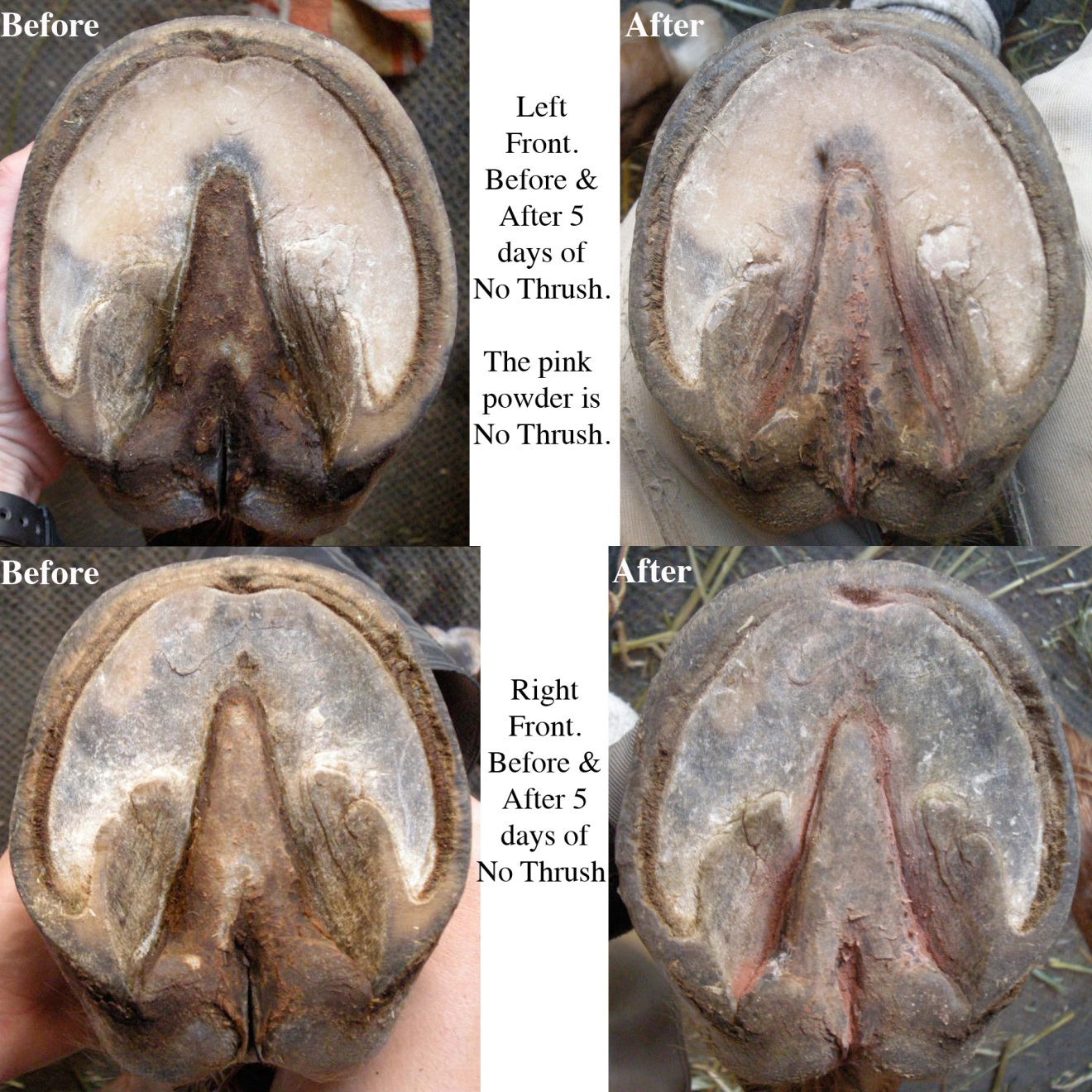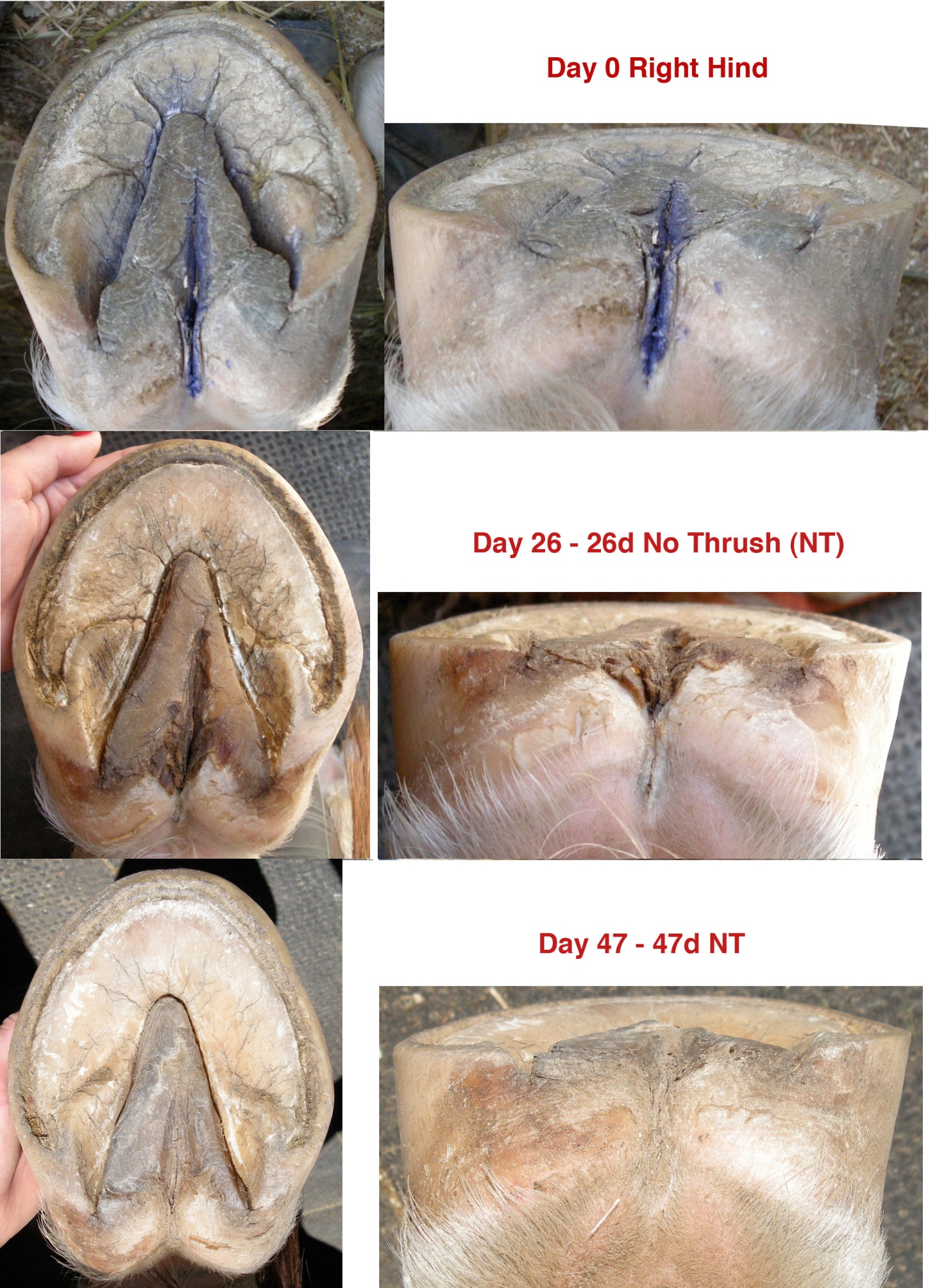 While I believe thrush is caused by accumulation of dirt and manure, for some horses, under certain conditions, even keeping their feet clean twice a day was not enough to prevent reinfection of the frogs. However, the individual hoof susceptibility to infection should also be noted, as I found one hoof (out of n=8), maintained good form with cleaning and debridement alone for 3 weeks, while others degraded before my eyes with the same treatment protocol. The jury is still out as to whether Oxine soaks once a week can prevent thrush better than daily cleaning. Unfortunately I have not compared Thrush Stop to No Thrush on frogs with very deep central sulci to examine the rate of healing from each. While my preliminary results would indicate that Thrush Stop should be as effective as No Thrush to heal chronic central sulcus thrush, this remains to be established.
