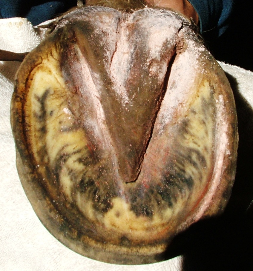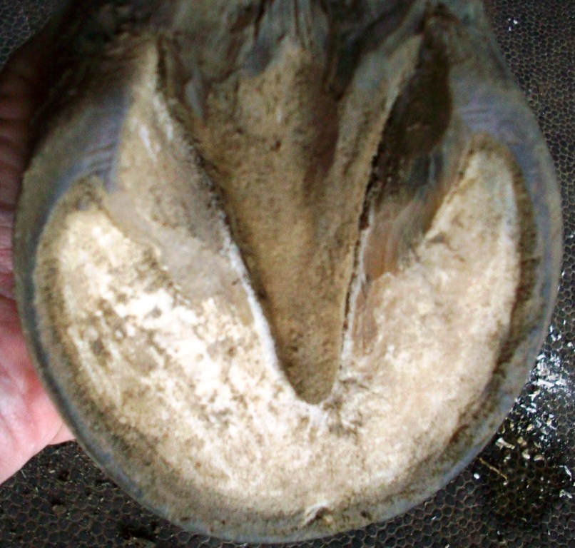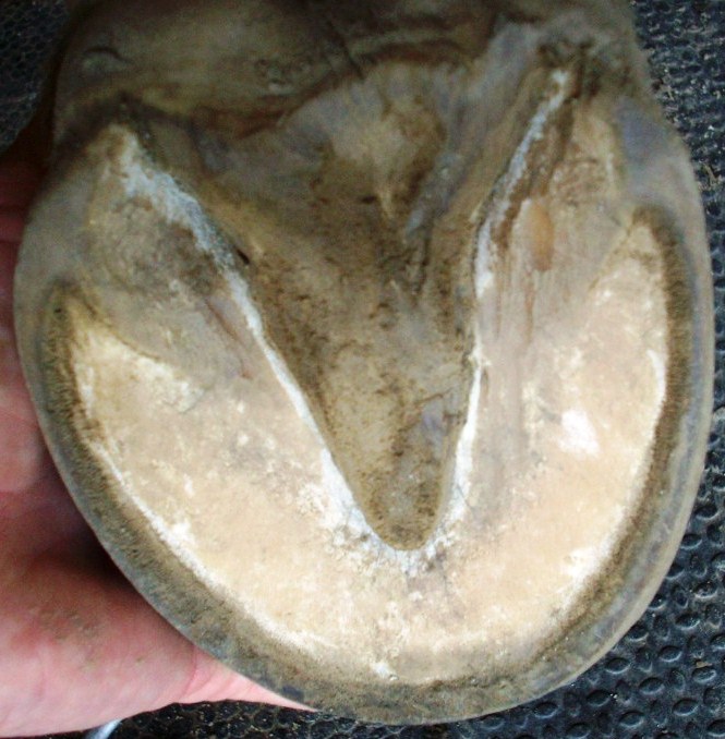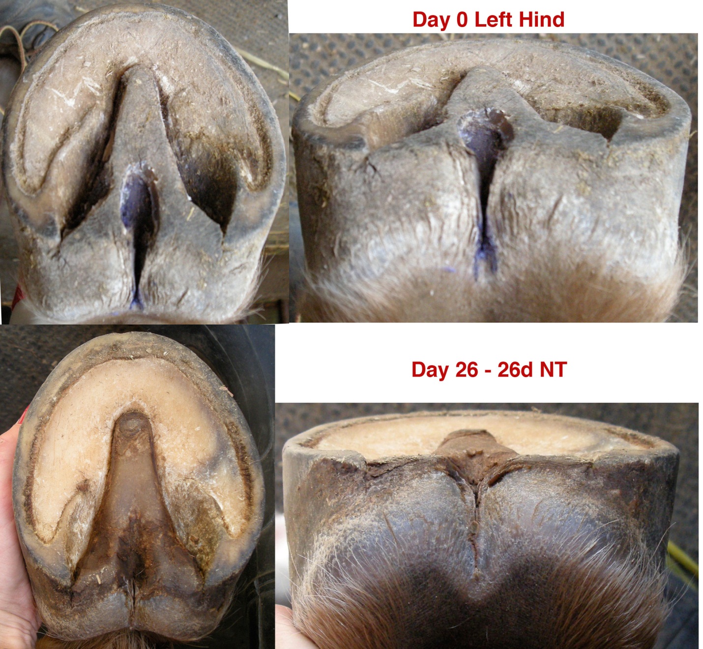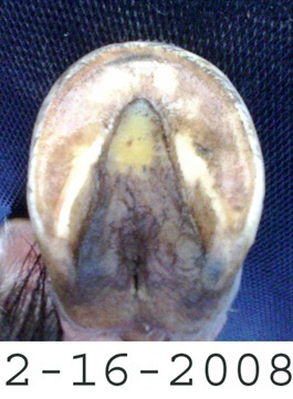 Three weeks of treatment that included daily or every second day of dusting with No Thrush produced frogs that were not sensitive anymore. The depth of the central sulcus was 50% shallower and the frog tissue was overall much firmer with no significant areas of surface thrush/cheesy frog. By comparison, the two Oxine AH soaked frogs were still sensitive to pressure, still had deep central sulci and significant surface thrush. These Oxine soaked feet were treated for a further three weeks with No Thrush daily. The No Thrush produced significant healing, the central sulci grew out and surface thrush was much reduced (Figure 3). One of these feet did not lose sensitivity to pressure deep in the central sulci until 4 weeks after daily No Thrush treatment was initiated (data not shown). The four hind feet varied in their time for healing, based on how deep the central sulci were at the start of the treatments. One hind foot was healed after 19 days of No Thrush treatment (Figure 4), a second took 26 days (Figure 5), while the third (Figure 6) and fourth took 6 1/2 weeks (Figure 7).