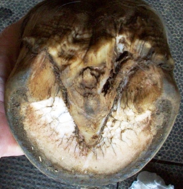 “…I read an article in The Horse's Hoof magazine written by Candy Platz and Heike Bean, and it could have been written about my horse. With help from Candy I learned that it is hard to keep a horse's feet healthy here in the Northeast where we have 6 months of snow and mud. I learned how to thoroughly clean my horse's feet and how to trim the frogs so there were no flaps to hold dirt and to get rid of the dirt line in the collateral groove. I started soaking all four of her feet with White Lightning three times a week for about three weeks. Then twice a week for two weeks. Then once a week for two weeks.