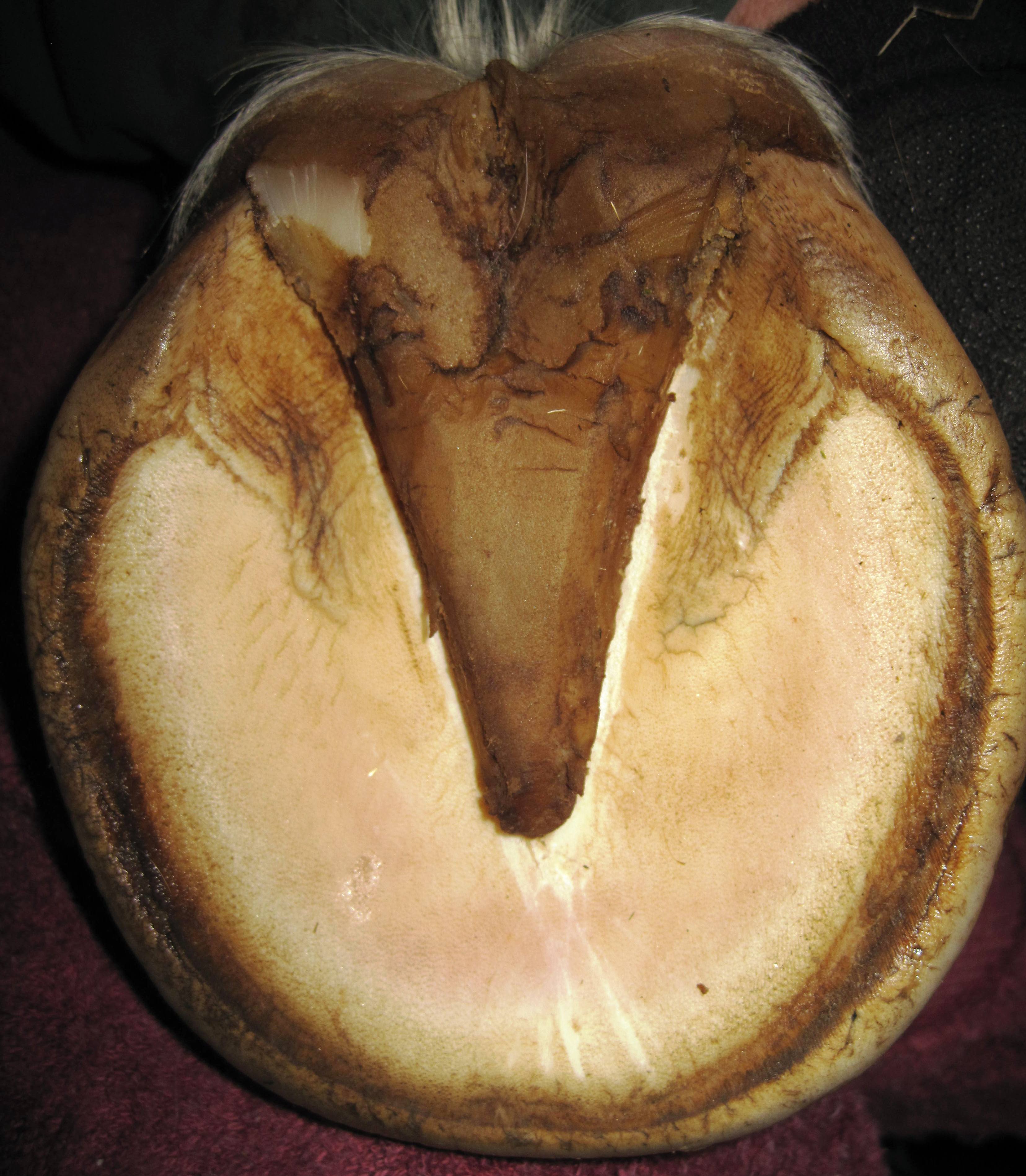 Fig. 2 shows my very first run-in with hoof wall disease. As I had no idea of what to do exactly, it got progressively worse, the horse was lame on all but very soft ground, and it took me over 1 year to resolve. Note how much the hoof capsule flared in the lower third due to the missing wall.