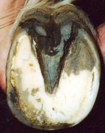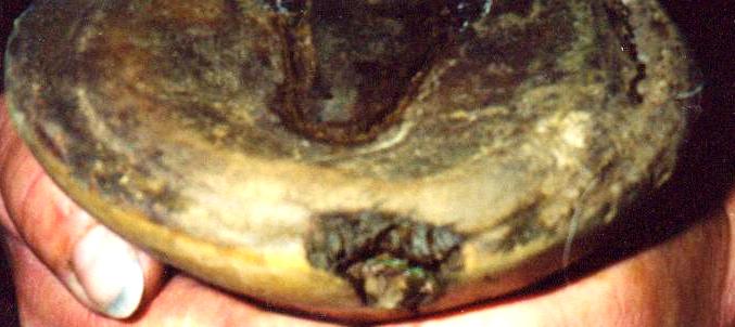 Fig. 4 shows an example of severe infection. The toe area has 2 holes and general inner hoofwall destruction. Most of the inner wall on this hoof is affected. Note also the diseased frog. (Unfortunately the picture is not very clear). I was called in to see if I could help that horse. The veterinarian had suggested hoof wall resection and therapeutic shoeing. The horse was moderately lame. With proper treatment, the horse improved very quickly and did not require drastic measures.