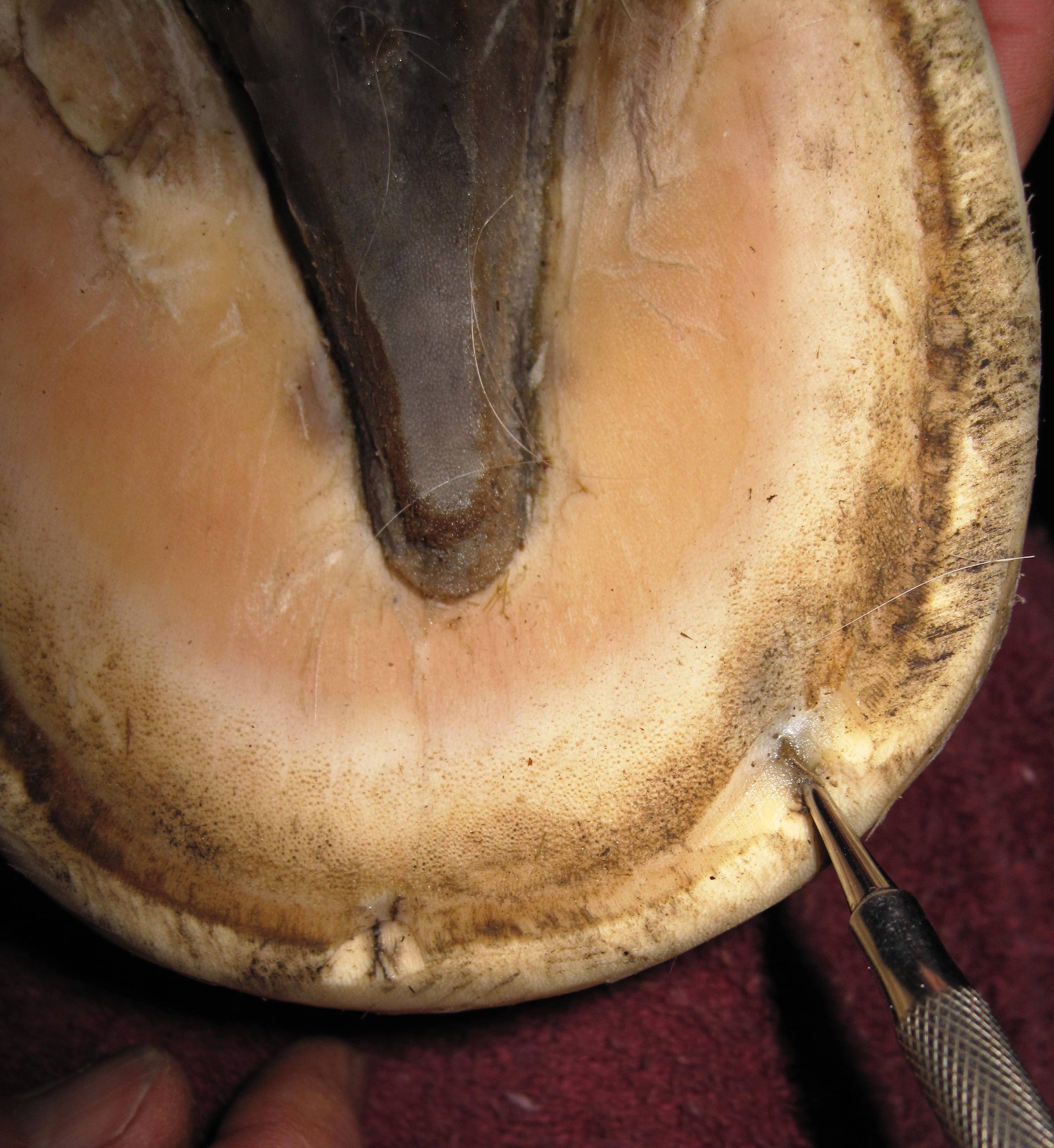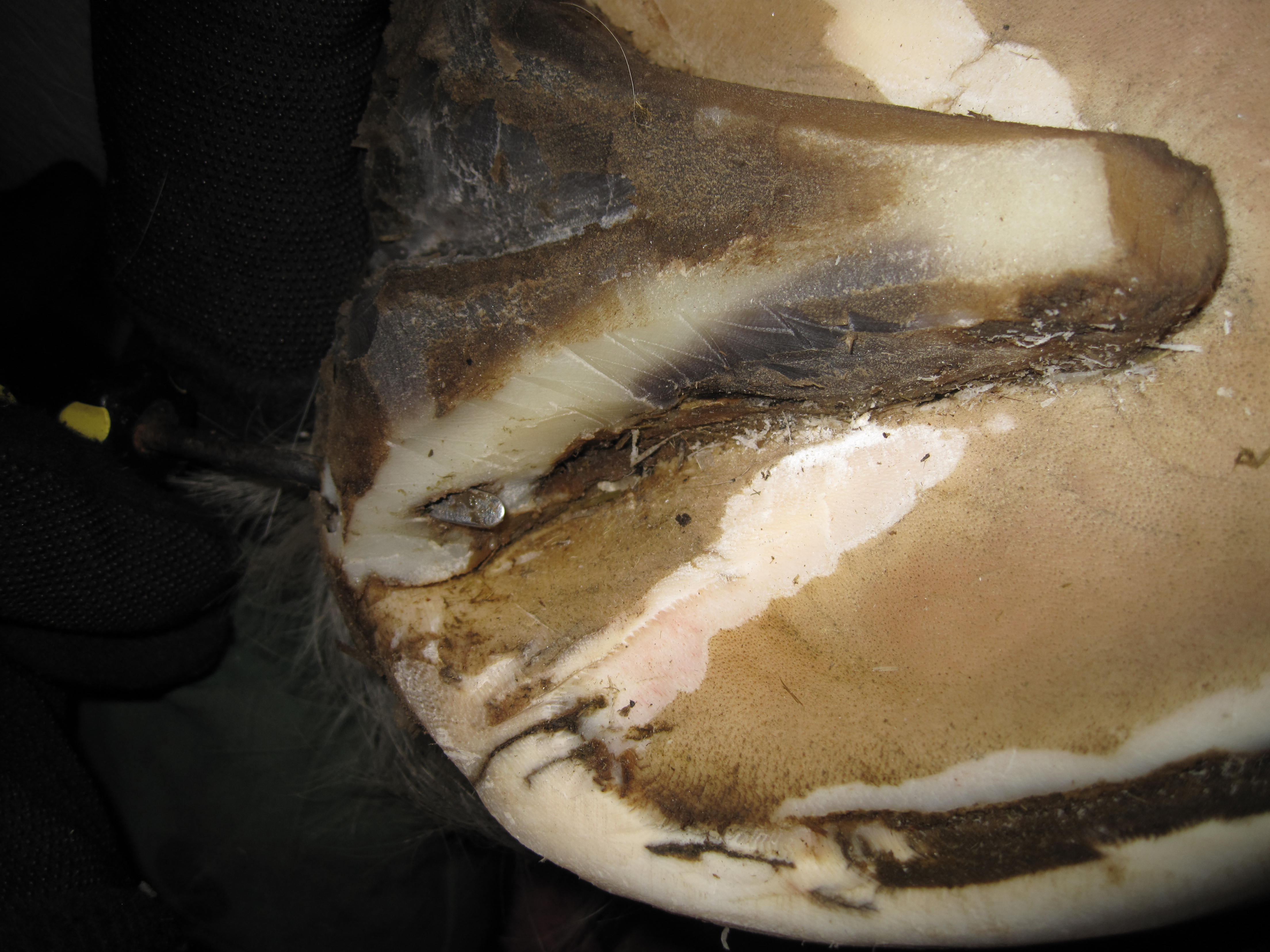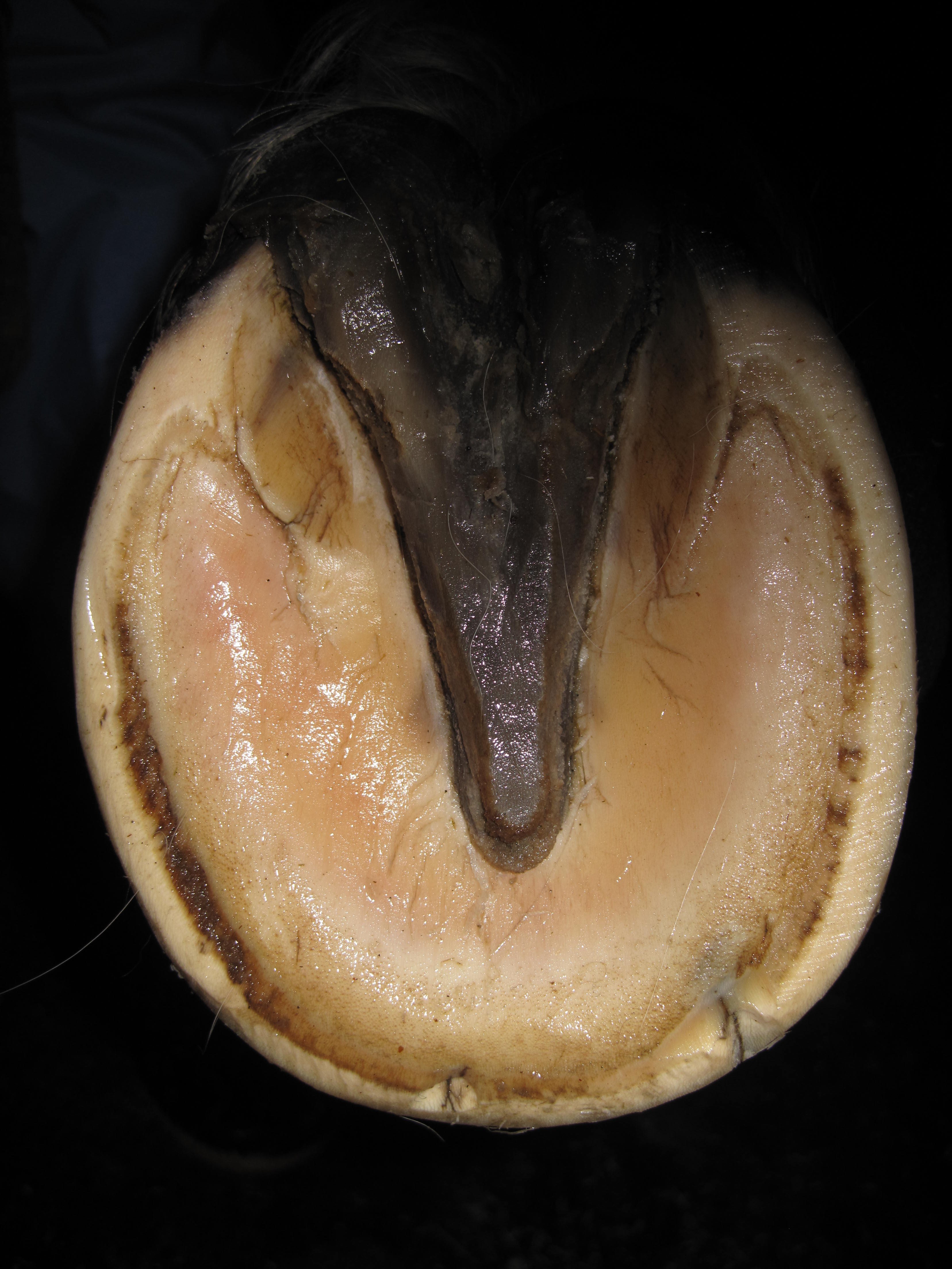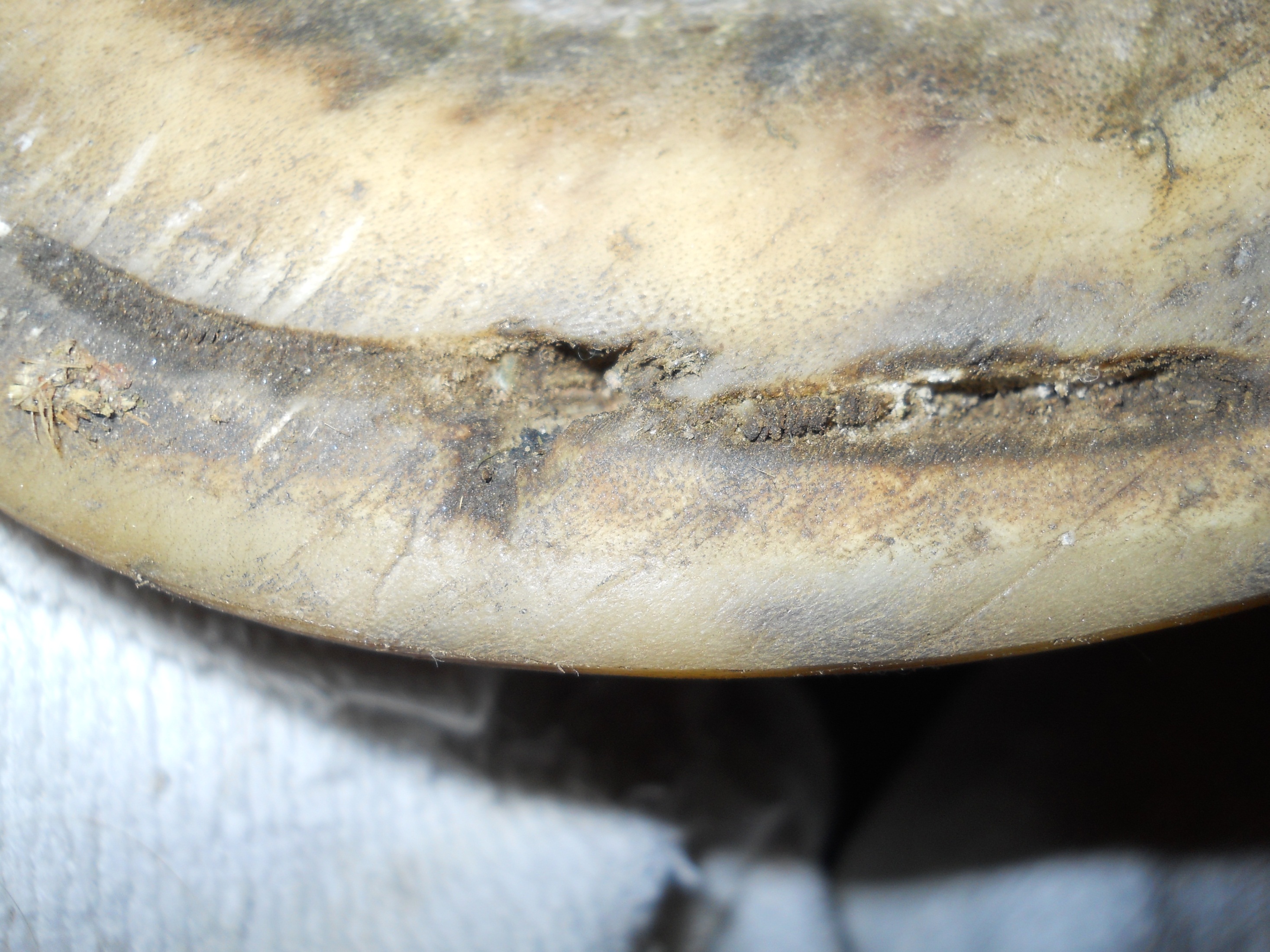 According to my observations, inner hoof wall infections seem to present in 2 major ways; as holes and as cracks of varying length and severity running either vertical or parallel to the white line.