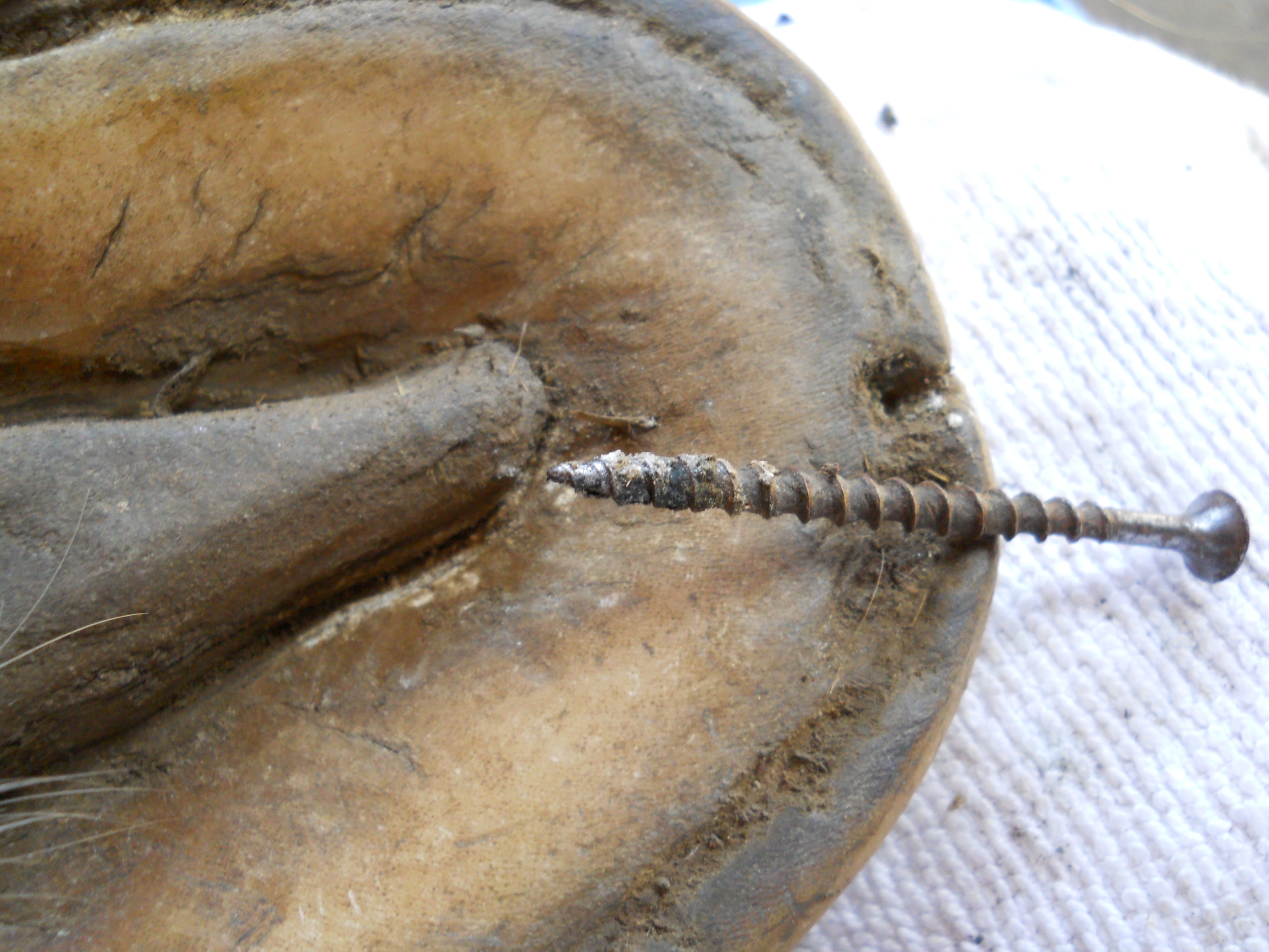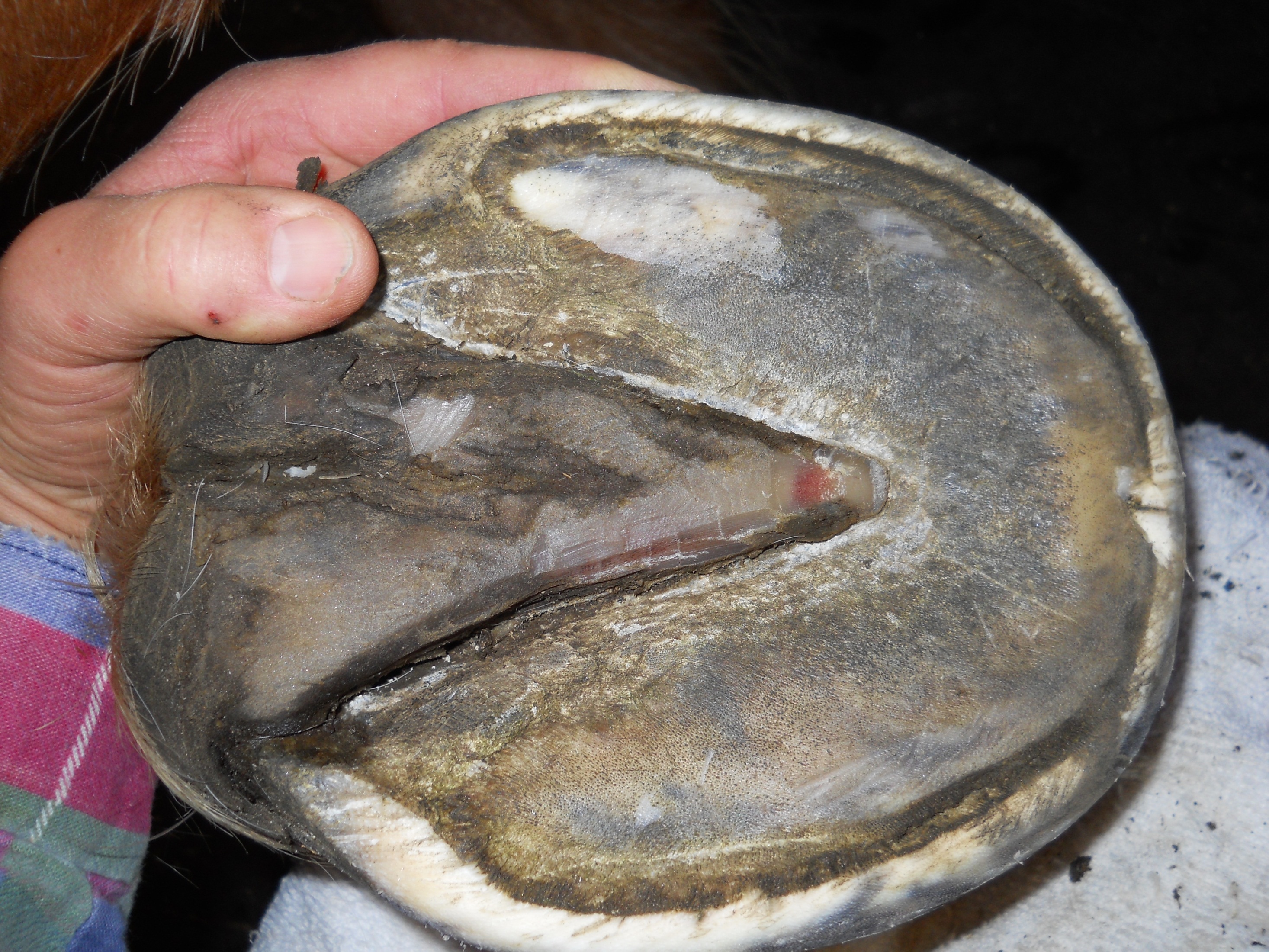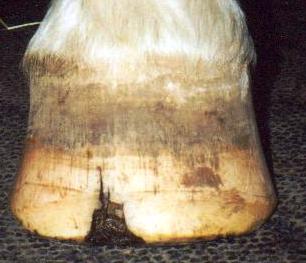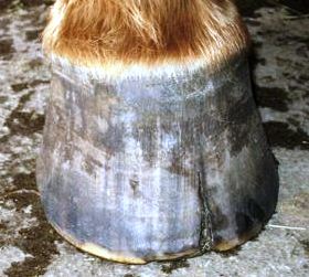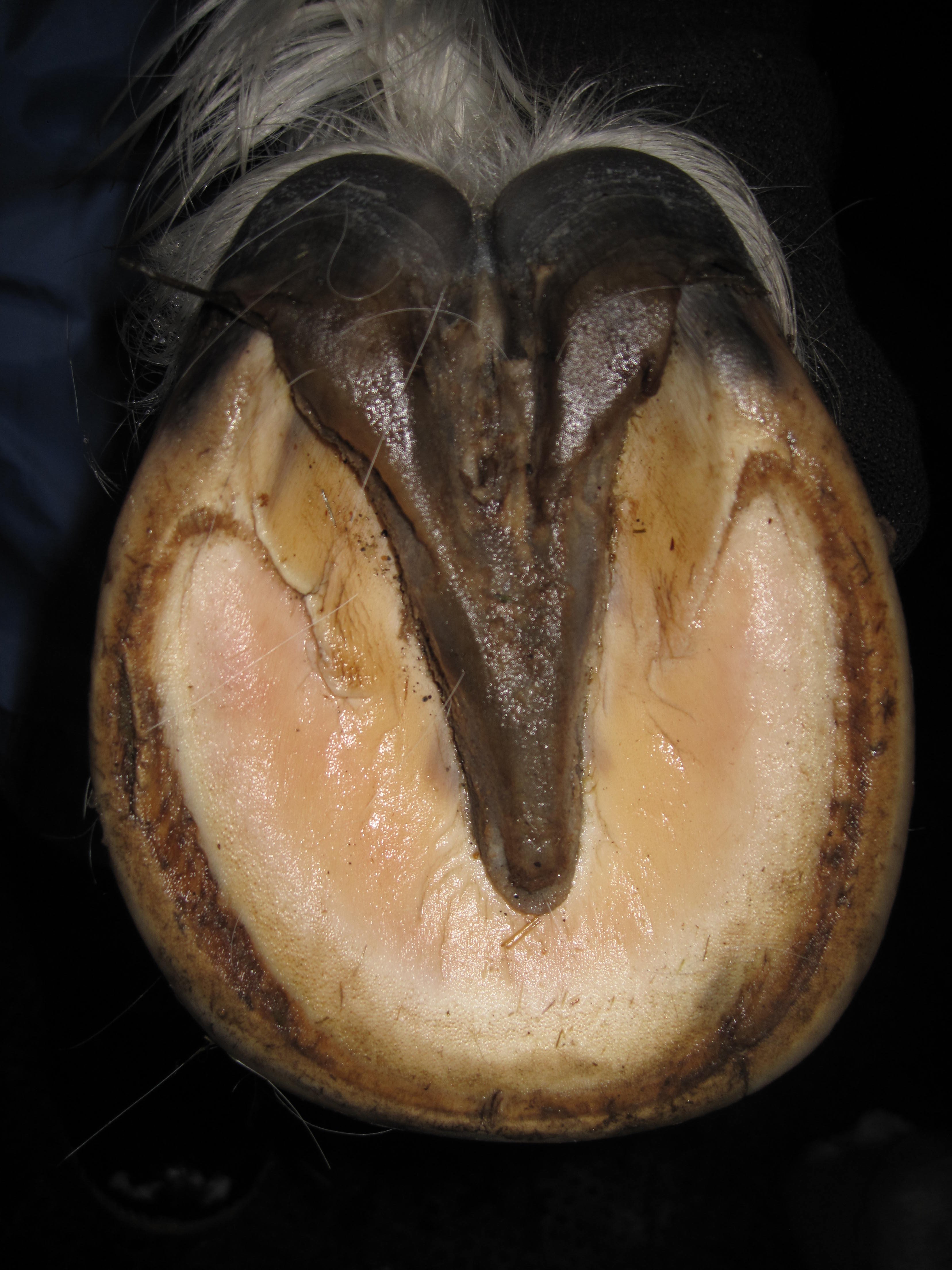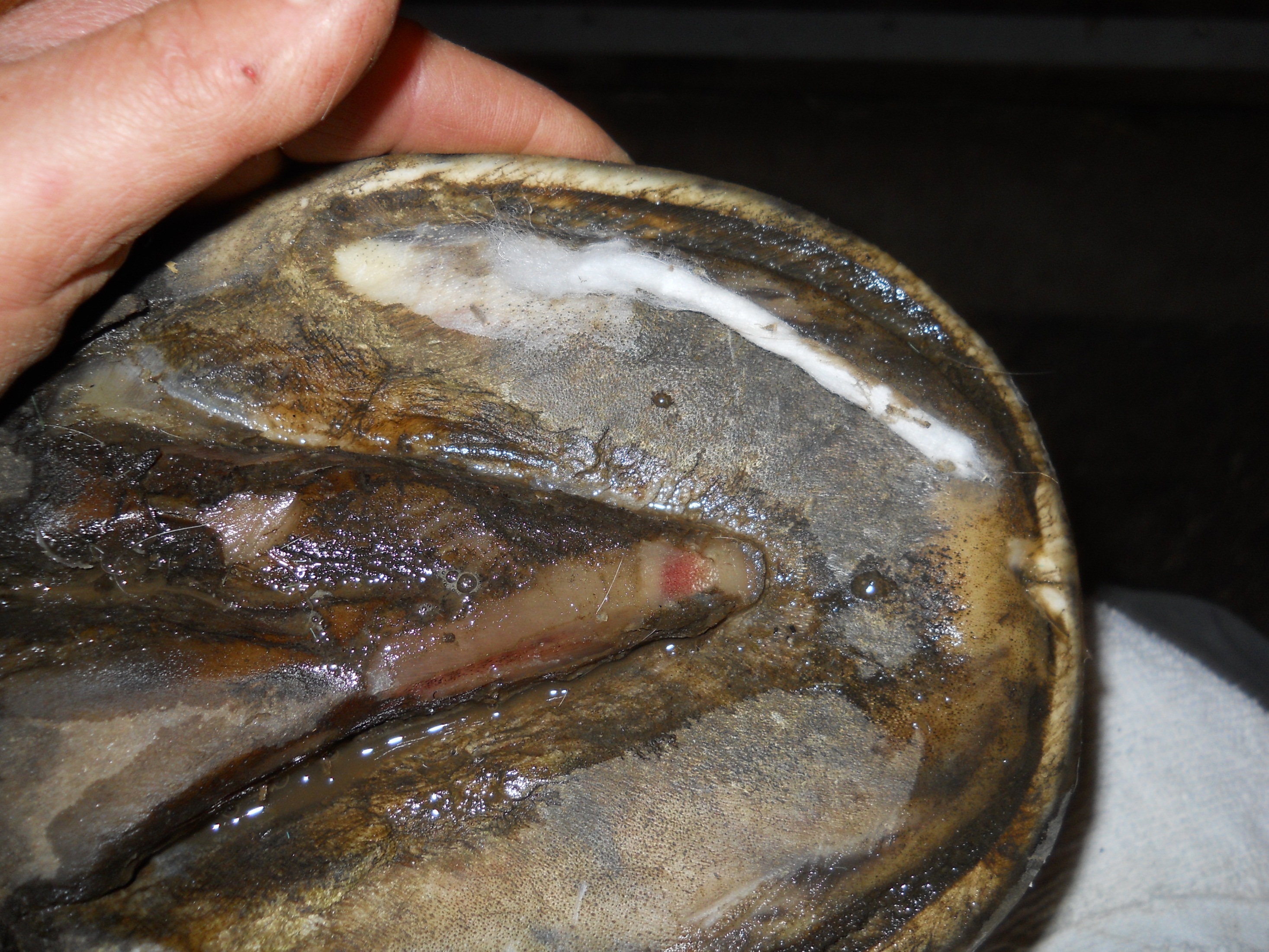 According to my observations, inner hoof wall infections seem to present in 2 major ways; as holes and as cracks of varying length and severity running either vertical or parallel to the white line.
