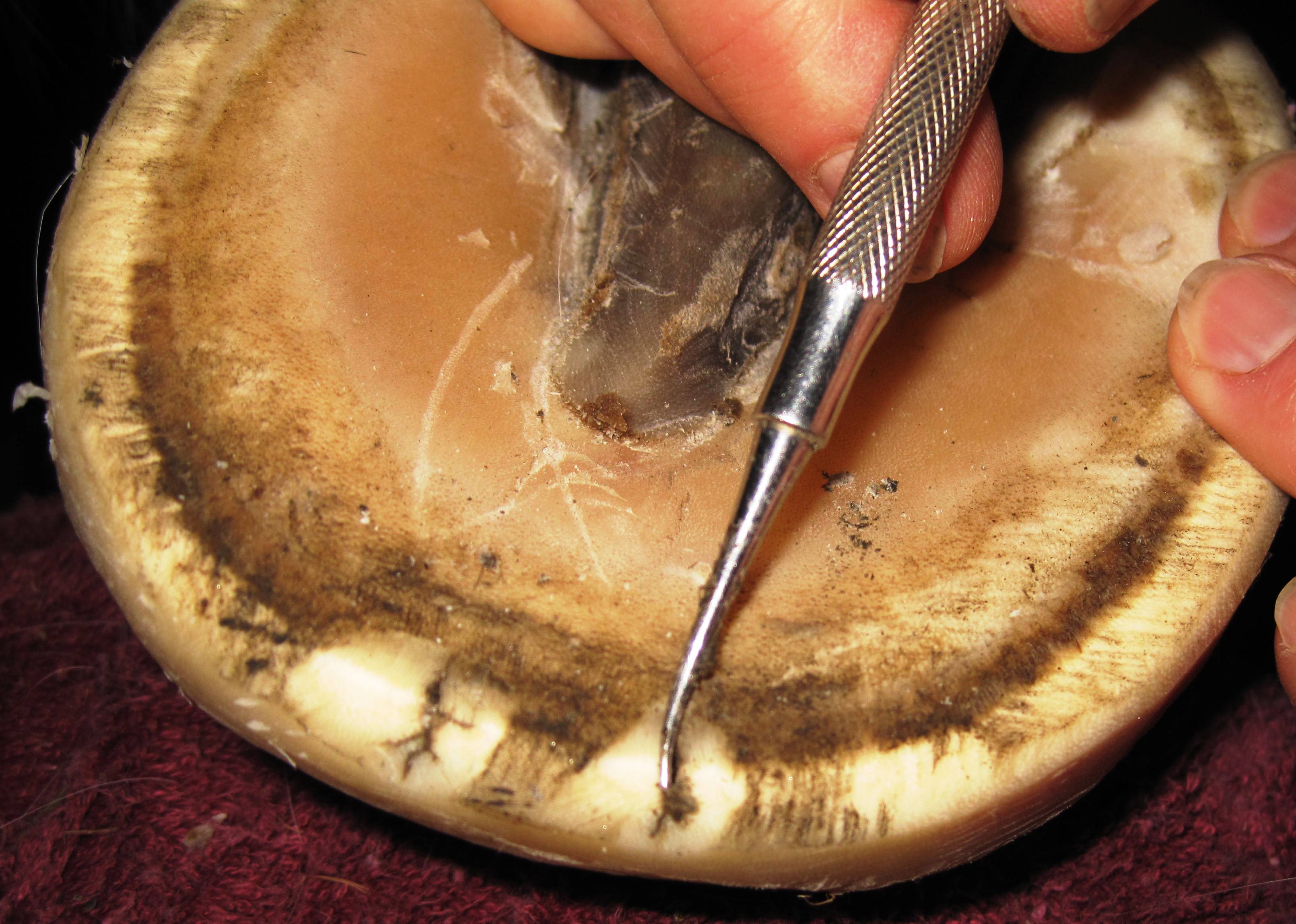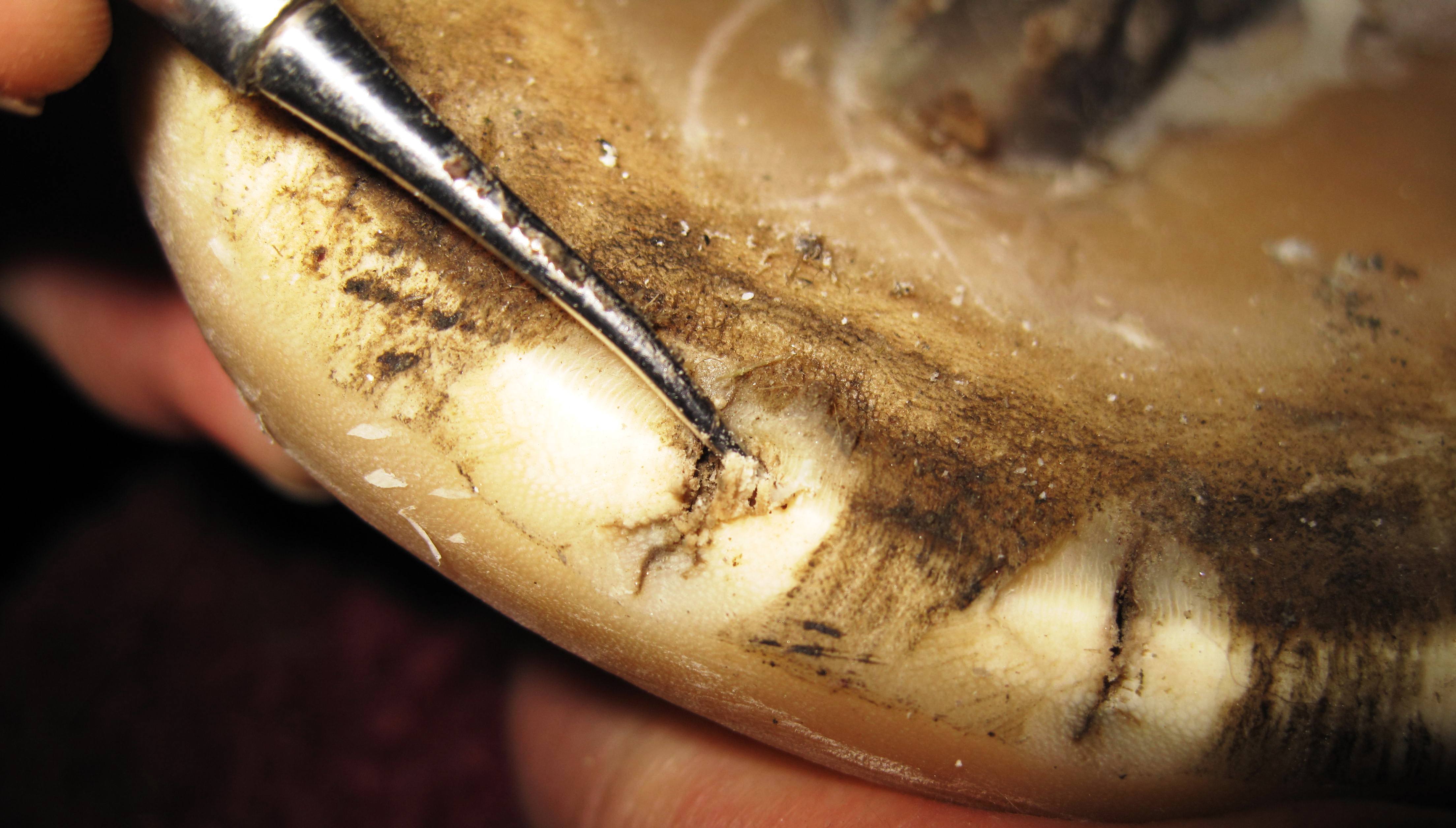 Cleaning out and investigating the depth of even minor appearing insults will insure that nothing is missed. I use several different tools for this. An awl can be helpful, a screw driver with the sharp edges rounded off, dental probes with the sharp tips removed, for very fine cracks an intact dental probe, and in cases of a small but deep cavity, I found a wood or sheet metal screw very helpful to extract the diseased horn and/or debris.
