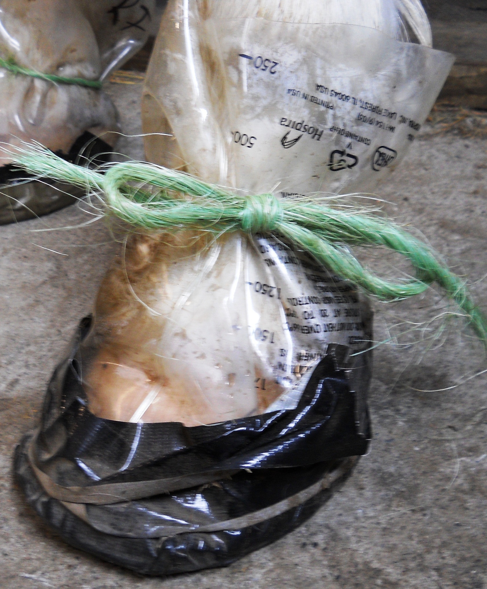 Fig. 19 shows the hoof in the IV bag hoof boot. I put plenty of duct tape around the bottom and let the horse out into the paddock. The boot lasts a long time that way and can be reused over and over.
