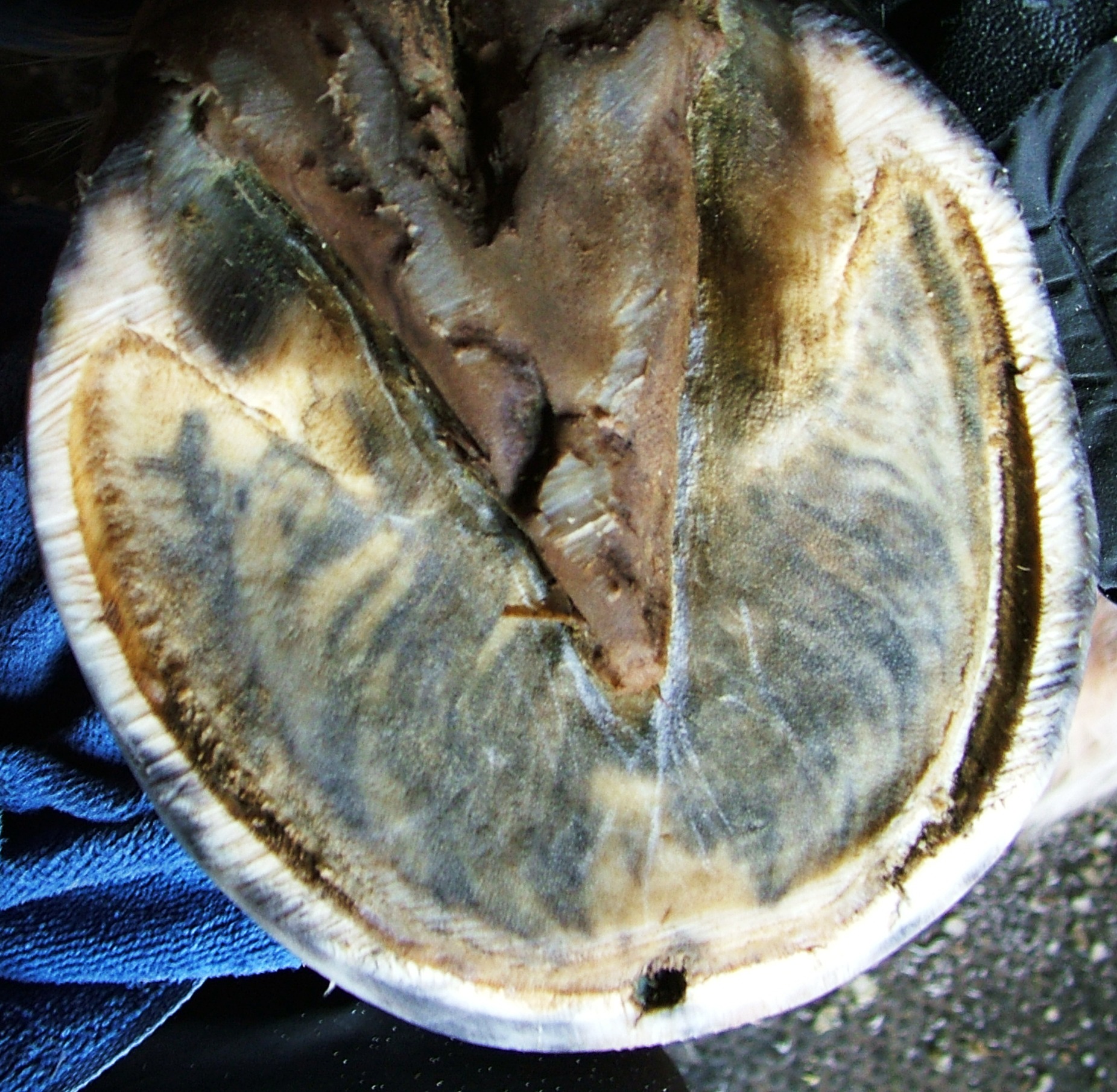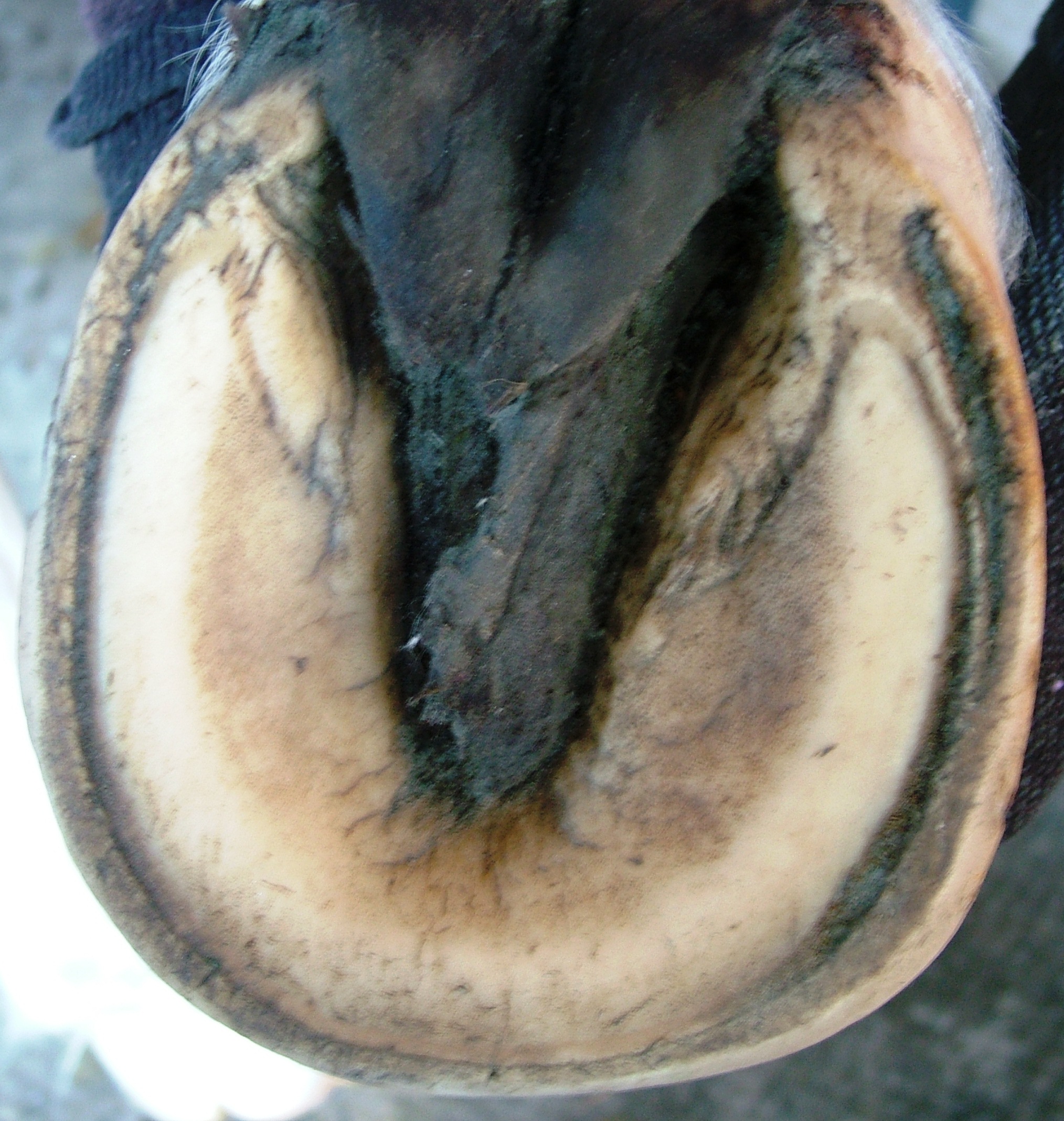According to my personal observations, black holes usually start with a small black crack across the inner hoof wall and often across the white line as well. They are mostly located in the toe area, probably because this area receives the most stress from the ground and allows for micro cracks that these anaerobic organisms need to get started and survive. I think this is also the reason why they don’t attack the much softer and less dense white line to begin with, too much air can get to that horn. Of course, eventually the white line is often invaded as well as the sole, but it is not the primary seat of this disease.