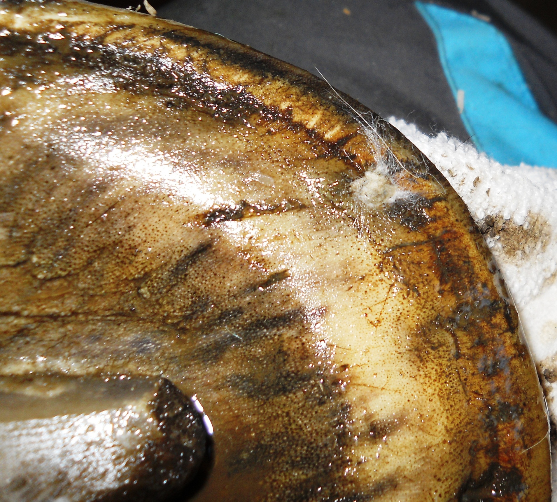 Additionally, I see those holes in different locations as well, not just in the center of the toe. But we may both be talking about a different scenario. I can only describe my own experience, and I do encourage the reader to look up the link above. Fig. 6 shows a hole in the quarter wall. Note how the wall is bulging out due to loss of integrity. The toe has a problem as well, and note the dark crack in the other quarter wall. Both can be the start of a bad problem when left unattended. Also note again the diseased frog. Frog- and wall infections most often seem to go hand in hand.
