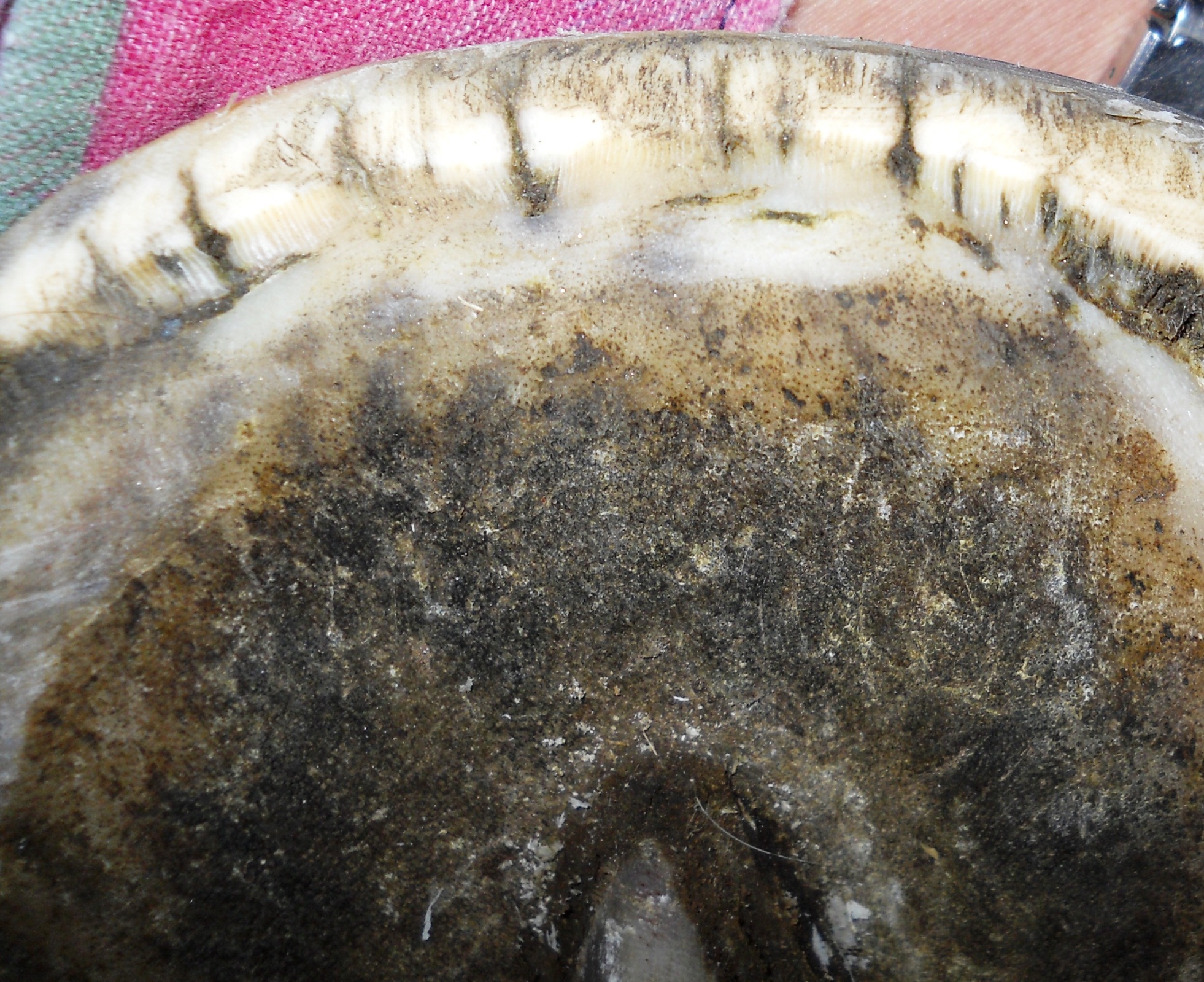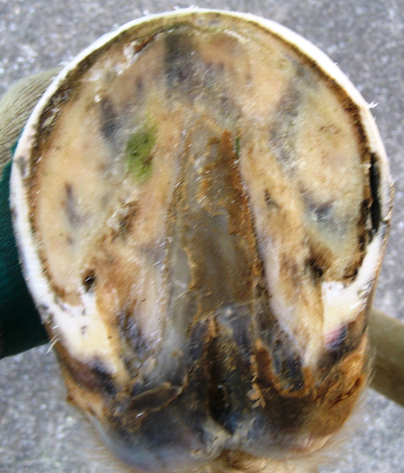 Fungal and bacterial infections in horses’ hooves are not limited to the softer frog horn. The inner hoof wall is also very susceptible to infection, and if these insults are not detected and treated in a timely manner they can lead to huge problems. In its later and very visible stages, such infection is commonly (and wrongly) called White Line Disease. Usually large areas of the inner hoof wall have been damaged by that time, and the horse is showing signs of lameness. Fig. 1 shows such a scenario.