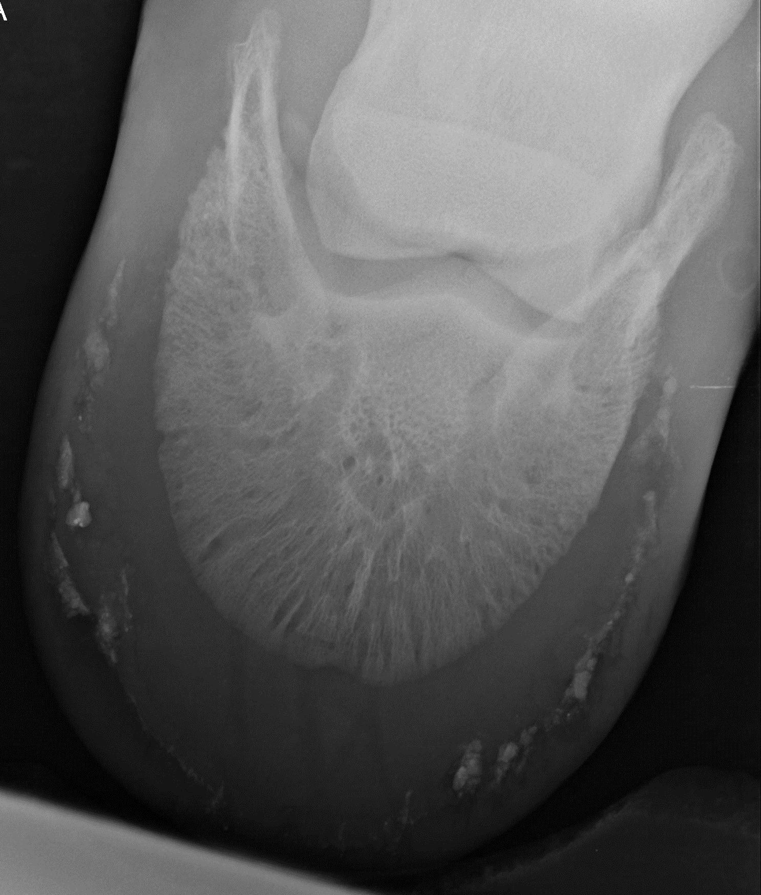If the infection is extensive enough the suspension of the coffin bone will be at risk. When it has progressed to such a state, the disease is very difficult to eradicate with disinfecting agents, as the microbes have infiltrated deeply into solid layers of the wall and can often not even be reached with soaking until the infected areas open up and become more accessible to the treatment. Meanwhile the destruction continues and can make the beginnings of treatment appear to be quite futile.