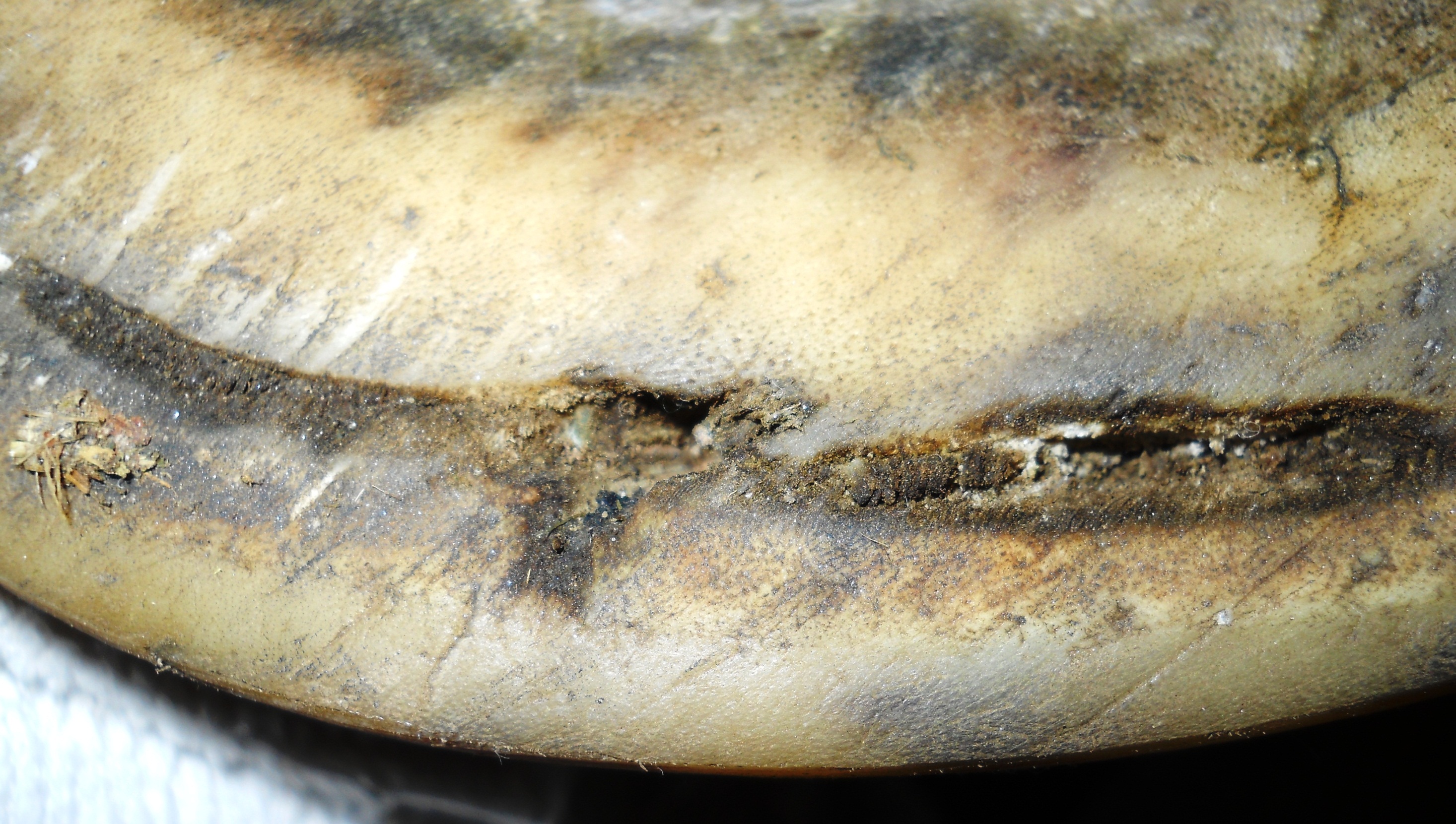 Another strange thing is that hoof walls can be totally pristine at one trim, and at the next there are several insults. And not all horses on the same property are affected at the same time or with the same severity, and not all hooves on the same horse will be affected. Sometimes it is only one hoof, sometimes 2 or 3. Sometimes all insults can be trimmed away, sometimes they all go deeper than that. There is no pattern.