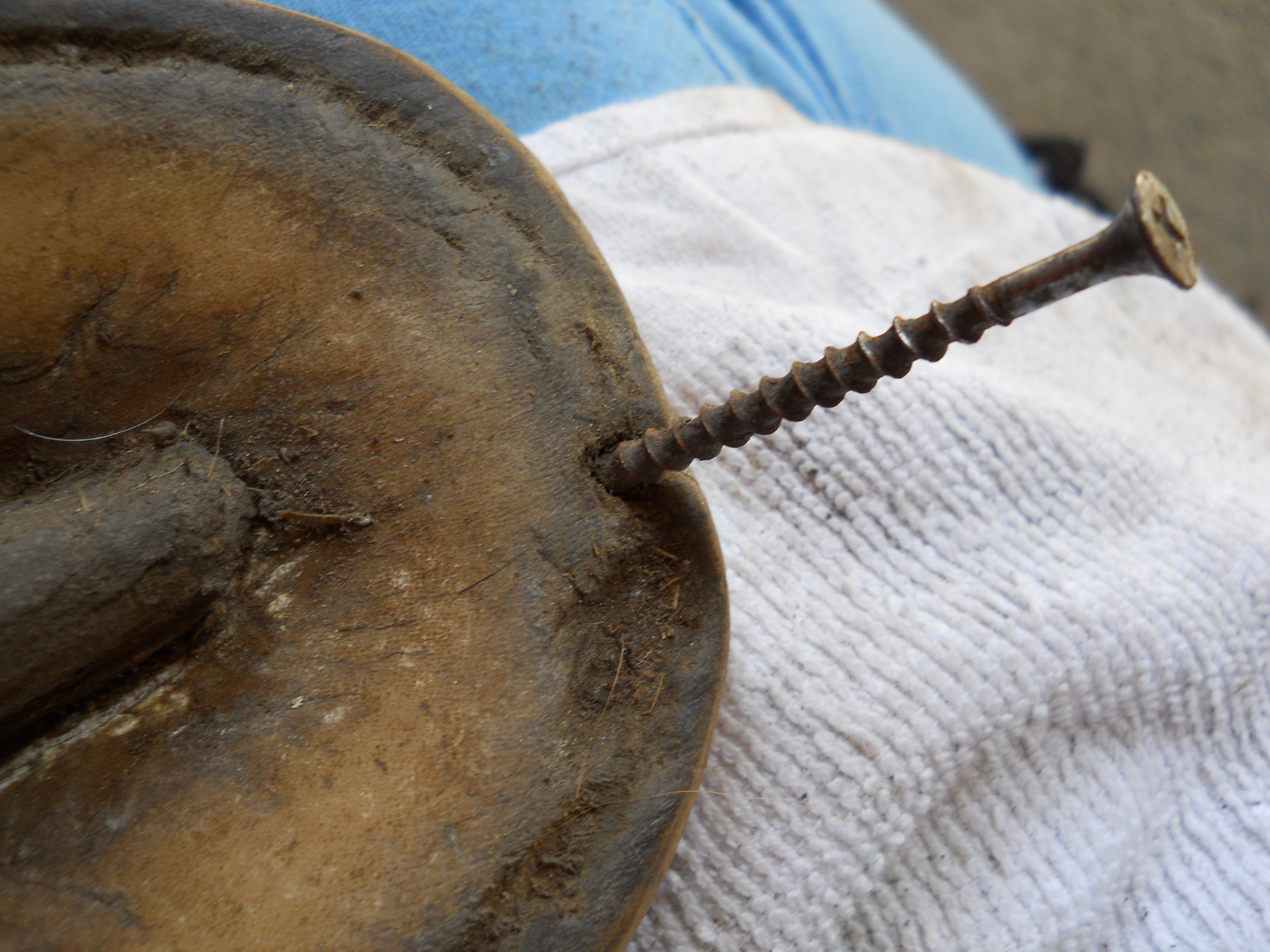 If the insult is large and deep, first remove as much diseased horn as possible, then the cavity can be sprayed out with a hose with lots of pressure or at the very least irrigated with a syringe, scrubbed with a brush and then dried with a towel or paper towels. For this, I push the towel into the cavity with my screwdriver, pack it in well and pull it out again until it comes out clean and dry.
