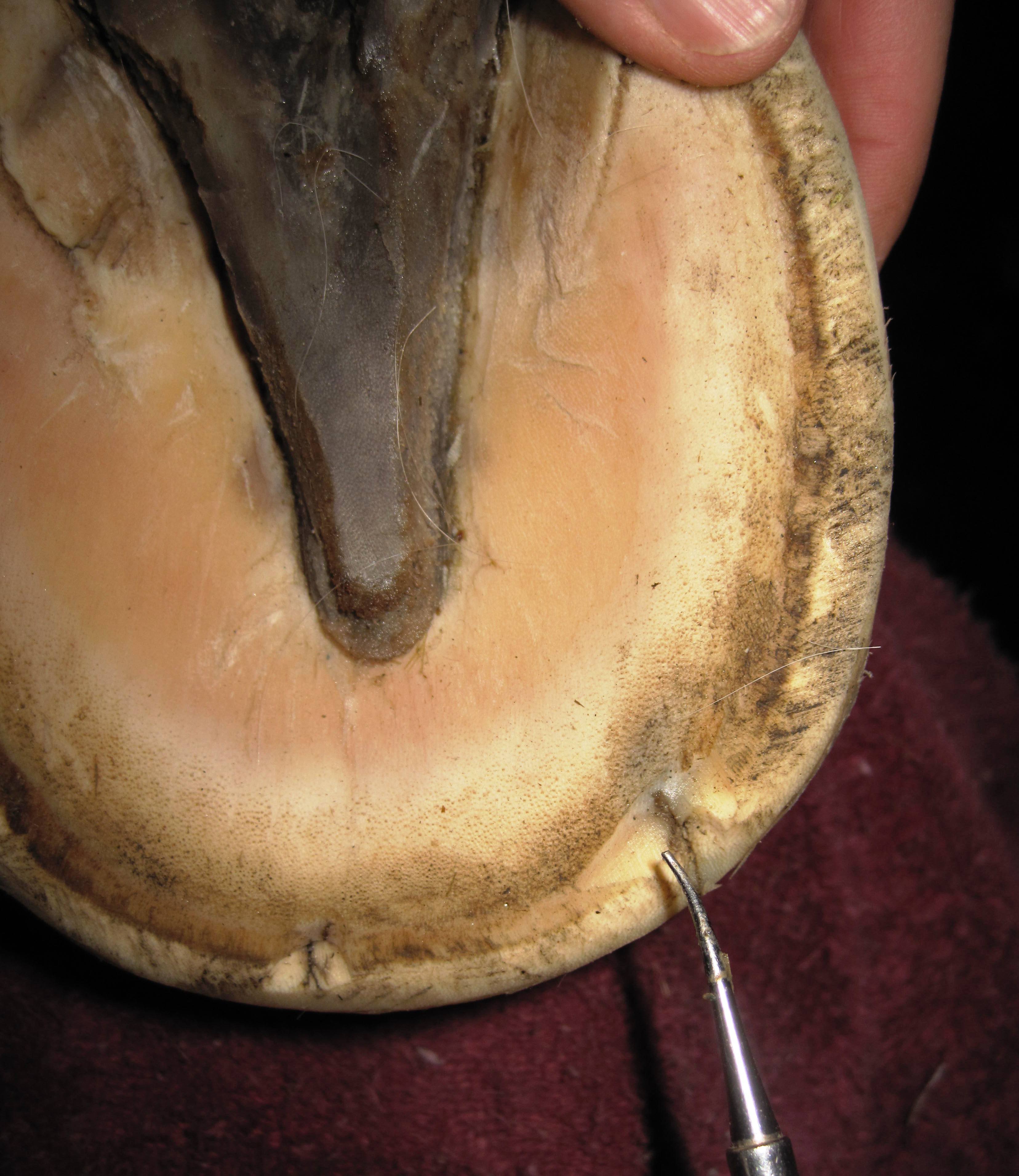 Sometimes, holes also develop in the sole area, right behind the white line. They are usually much harder to find as one seldom trims in this area and sole pushes over the insult, totally hiding it from view. I had such a case, but unfortunately did not have a camera handy. There was just the slightest indication of a little darker area, and the adjacent white line looked a bit strange.