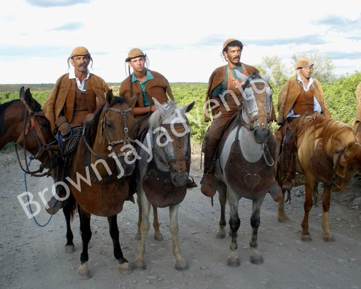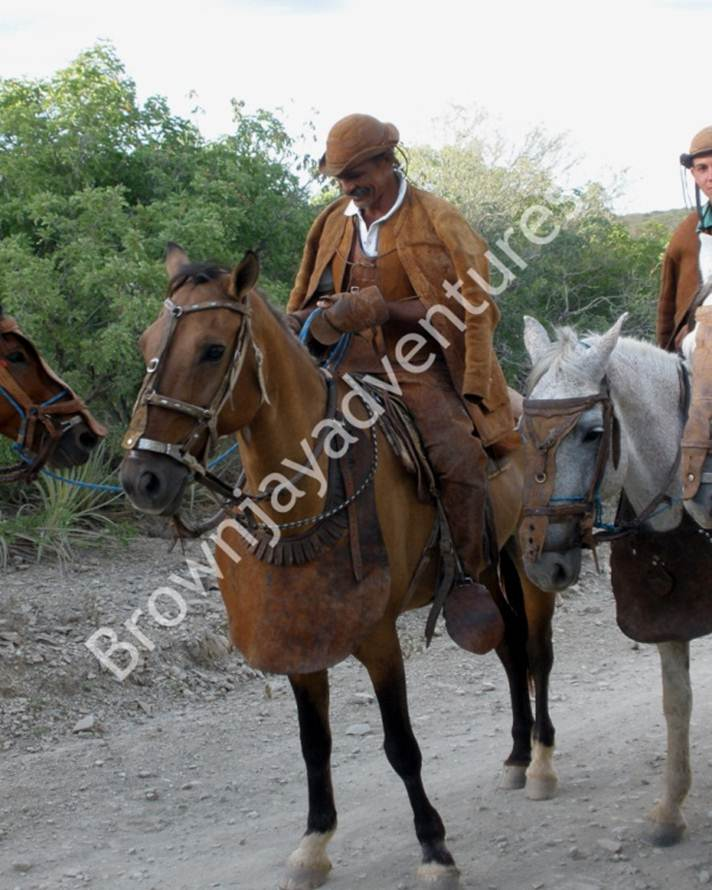Caatinga Horses & Riders On one of our return trips to the hotel we came across these cowboys of the Caatinga. It was 95 to 100 degrees F and if you notice, everyone, including the horses are wearing leather which protects them from the thorns. They must have been very hot with leather hats, coats, coverals, and gloves.