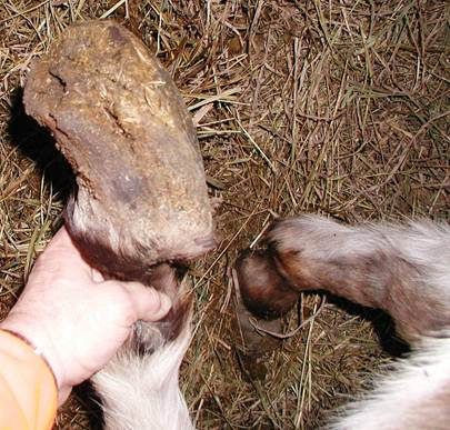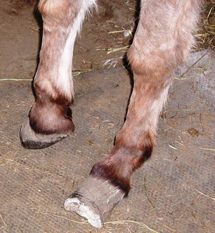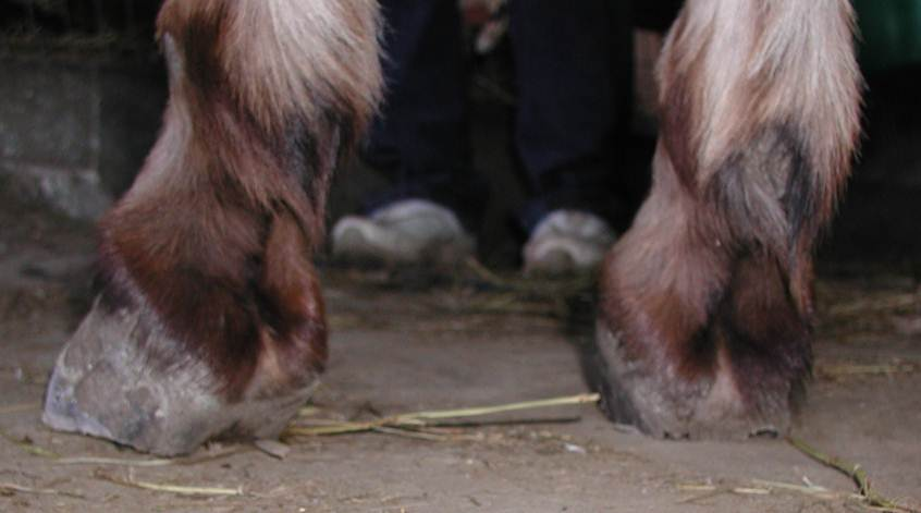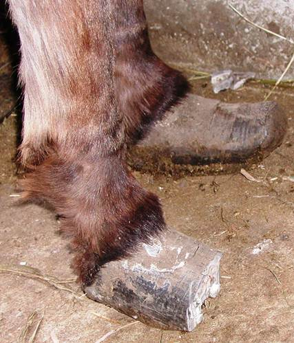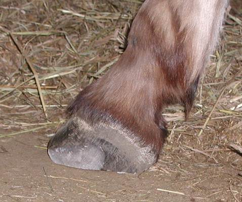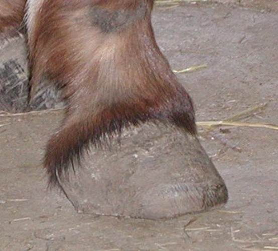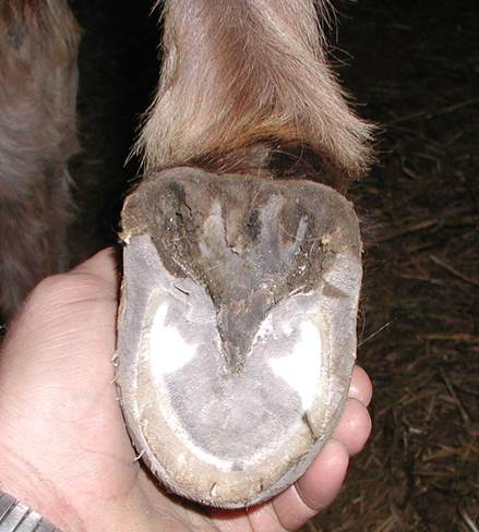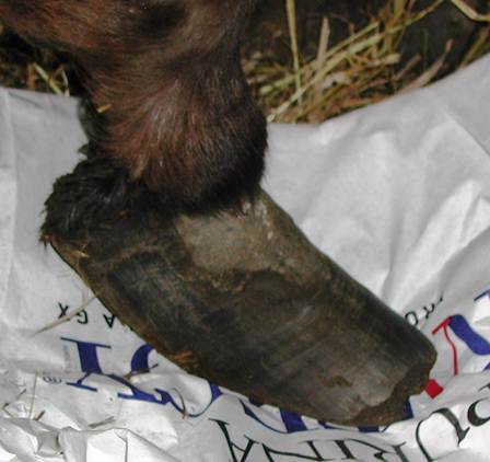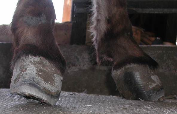 Right hind This is Cody in his elf shoes. Unfortunately it is his real foot and a very serious situation. I am proud to say that this foot was back to normal looking in a short time. Again, I worked on the back feet together for a couple minutes at a time to keep Cody from having to stand on a foot for very long. It worked out well. In this photo you can see where a previous farrier attempted a trim but realized it was too much for them and stopped.