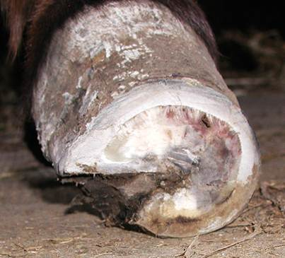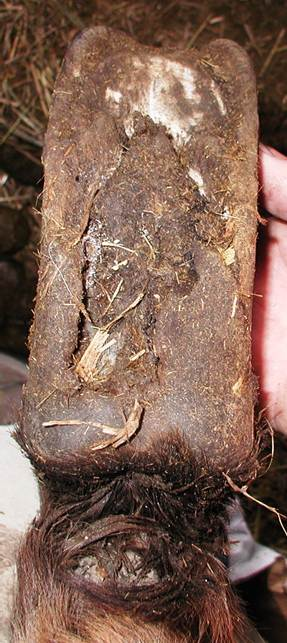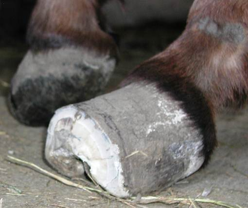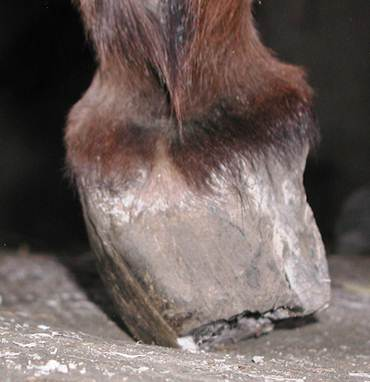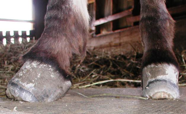 Both hinds Photos of the back feet during the trimming process. Here I have them back under Cody but have more trimming and shaping to do. In the view from the front, you can clearly see that the lower hoof wall will be made of Lamellar wedge until a new tight well connected hoof wall is able to grow down. The lamellar wedge material will still provide support and load bearing duties for the hoof. It may not look pretty but Cody loved it.