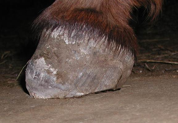 The foot after completing the trim. You can see that the lower hoof wall at the toe is made up of lamellar wedge material. This material will be there until the hoof wall grows down tight and well connected.