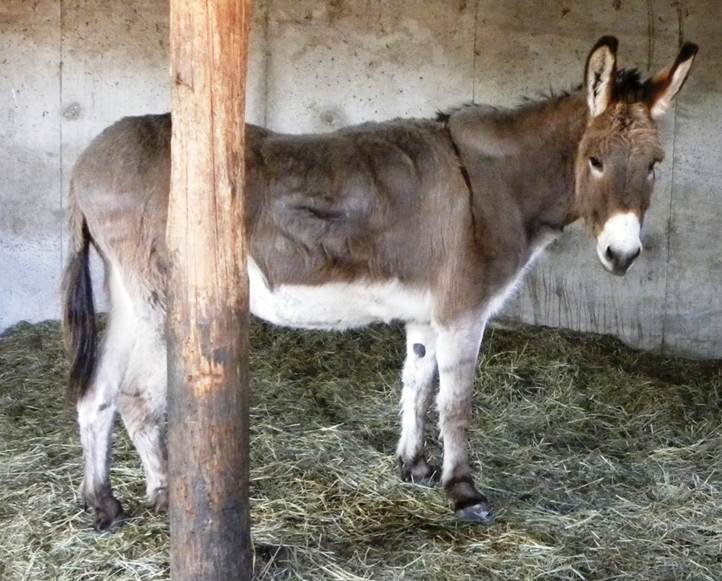 Cody today This photo is Cody 2 years after that first trim I did for him. I am still trimming Cody on a 6 week schedule. Cody is still allowed to graze rich sugar filled grass which is his worst enemy. I am able to keep the feet in shape but due to the rich sugar filled diet that Cody is still on, there is still laminar separation at every trim. The separation is much less than in those first few months of trimming, but it is probably going to be impossible to grow a tight well connected hoof wall due to the sugar in his diet. A diet change must happen before the separation will go away. Cody shows the classic fat deposits of a diet not suited for a burro. Even though Cody still exhibits separated laminae, I do not see any pain distress in him. He has become a very good patient and stands well for me. I enjoy visiting him. I owe a tremendous amount of thanks to Cody. He probably does not know it but he taught me a great deal about feet. He made me smile. I want to thank Heike and Marjorie too. Their advice, guidance and encouragement made this trim possible. Thank you ladies. I want to thank the owner too for trusting me enough to help Cody.