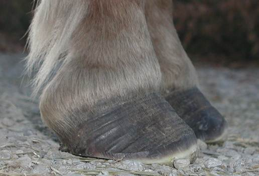 These are the back feet. I had seen pictures of feet like this and have read case histories of the trimming of such feet. But when faced with the actual situation, it becomes more real. These feet were rock hard. I used my nippers to cut off small pieces at a time. In hindsight. I should have used a saw to just take most of the growth off in one step. My nippers took a beating working on these feet. The feet are disconnected to the cornet band and he is walking on the back of his heal bulbs. My first concern was to get the huge amount of overgrown toe material off and the try to get some heal back under him. I thought hopefully this would allow him to move better and be more comfortable. My goal was to get the back feet into a more normal position/shape and the owner would be able to take over hoof care since she is a farrier. The pony was kept in a good sized dry lot so he had a lot of area to roam and he was fed free choice hay. I watched him move after I trimmed him and he actually roamed around the dry lot well.