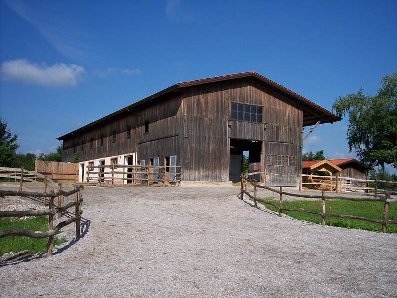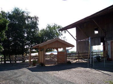 This is the smaller covered loafing area with 3 large and airy box stalls ( 2 have a small paddock) for sick horses or other occasions.