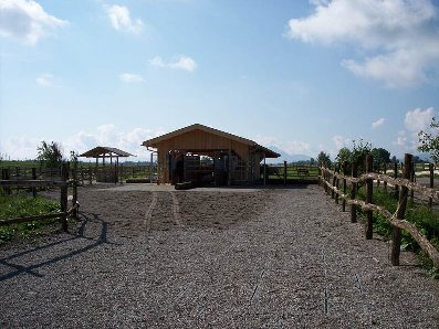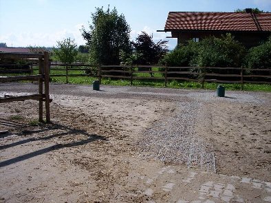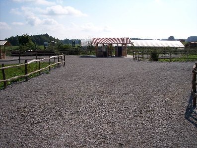 This picture shows the double gated entrance to the horse area. In the foreground on the right is the wash area. In the background one can see a hay feeding station.
