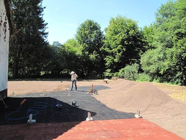The next day at 6 am the first truck with gravel arrived and then one after the other until 11 trucks later and in late afternoon all the gravel (over 110 tons) was there. They spread it using tractor and excavator, shovels and rakes. And then they wanted to use the plate vibrator And it got stuck. The material the supplier had delivered was too soft. It would not pack using the plate vibrator. By that time I was so exhausted I only smiled mildly and said to keep spreading, we would lay the mats on top anyway. That turned out to be a good idea and worked nicely, as the gravel packed itself then with the weight of the mats, some rain and us walking over it.