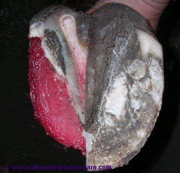 Trimming and debridement of affected tissue is the cornerstone of treating frog disease. This process must be continued long enough to remove all diseased tissue (which may be days or weeks) and frequently enough to remove compromised horn as it grows out before the disease process has a chance to extend deeper into the frog. Initial treatment involves the removal of as much diseased tissue as possible without invading the live frog plane. The image in Fig. 36 may be helpful to understanding the anatomy of this area. As a general guideline, removal of compromised horn should not cause pain, lameness or bleeding. If in doubt, err on the side of being conservative. The frog grows quickly and it is better to remove tissue gradually over several days than to risk further damage to the frog by overzealous trimming. Fig. 36. Photo courtesy of Jenny Edwards (http://www.all-natural-horse-care.com/)