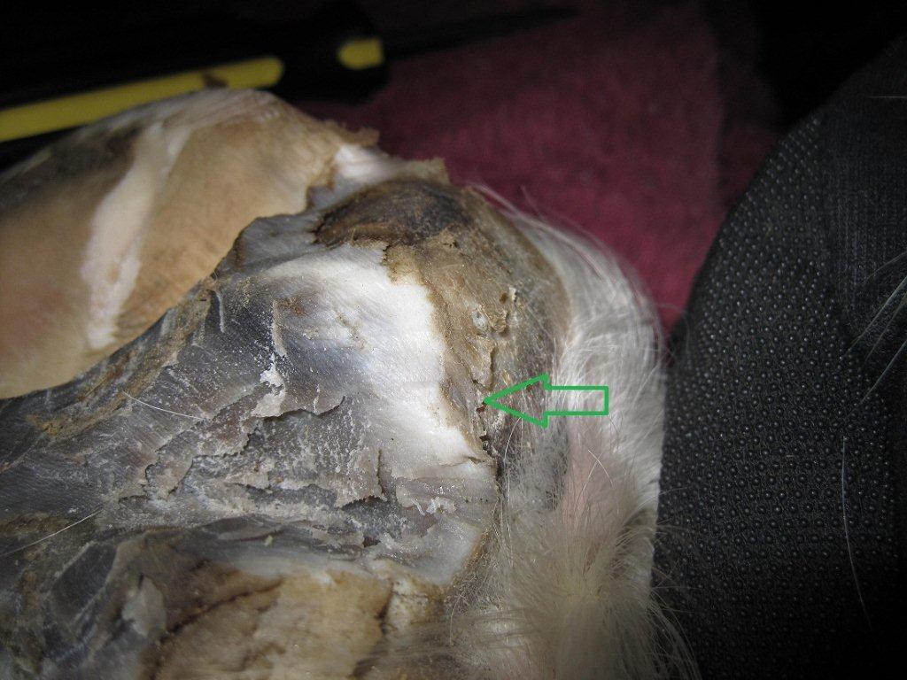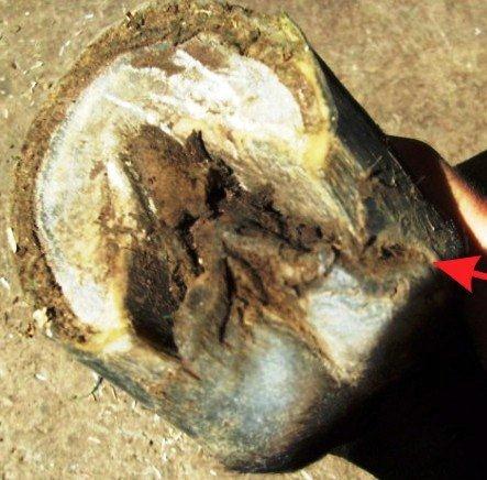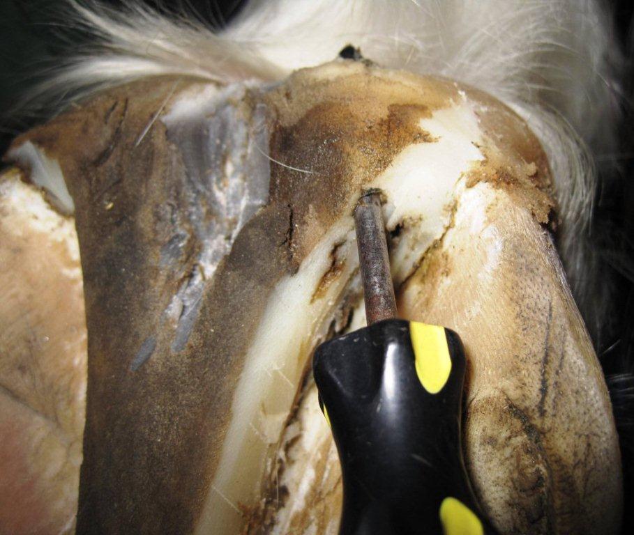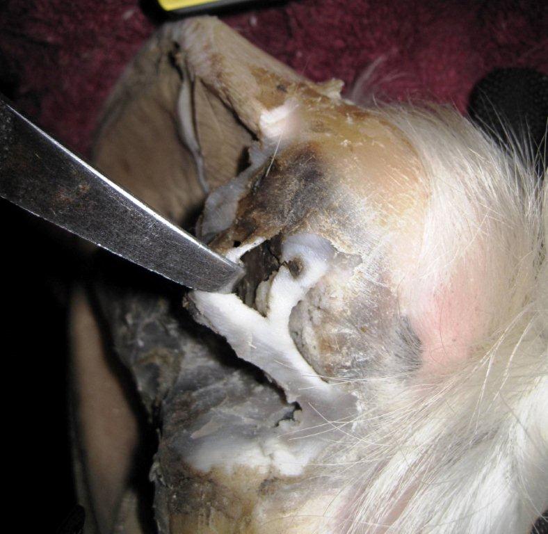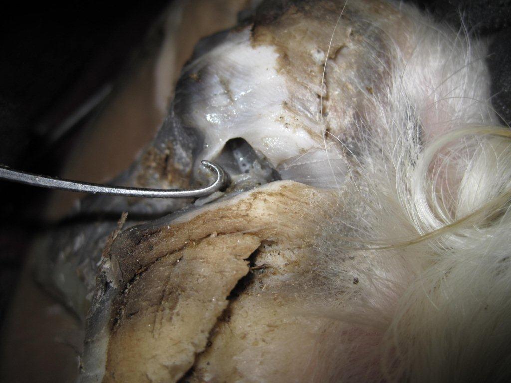 Continued inspection (Fig. 46) reveals even more damage. Note also the deep pocket on the other heel bulb. These pockets are usually started by harsh ground conditions. Once the bulb skin is cut, it cannot reattach, and the resulting defect becomes a haven for microbes.