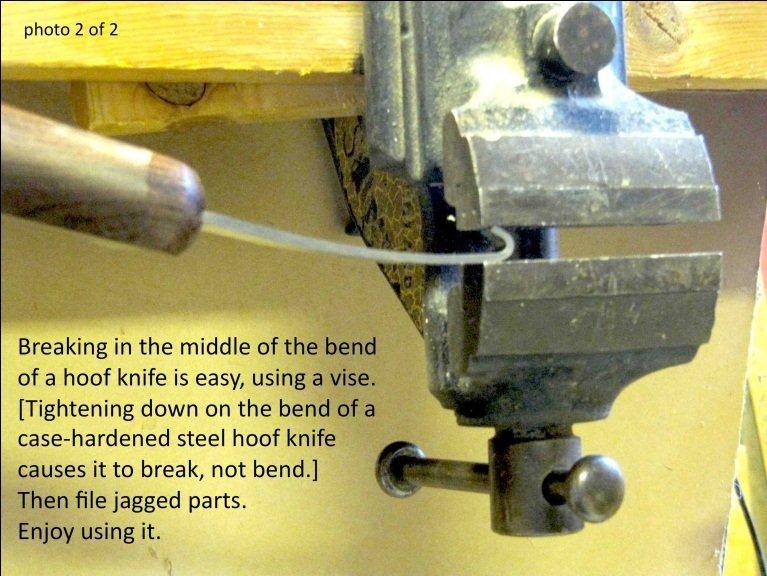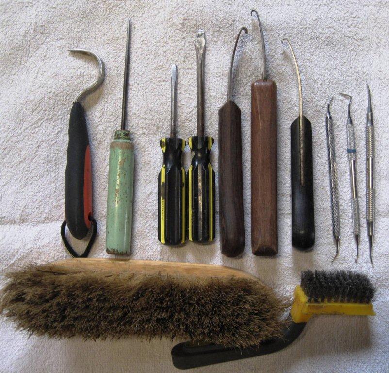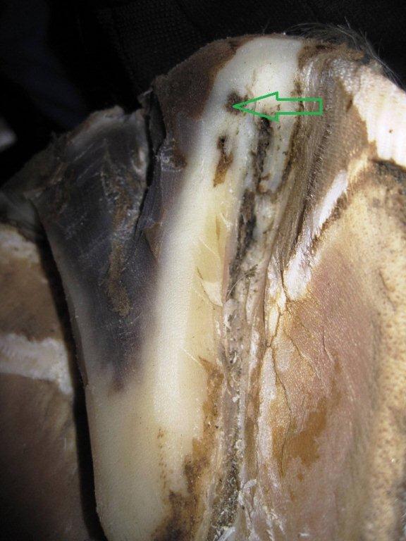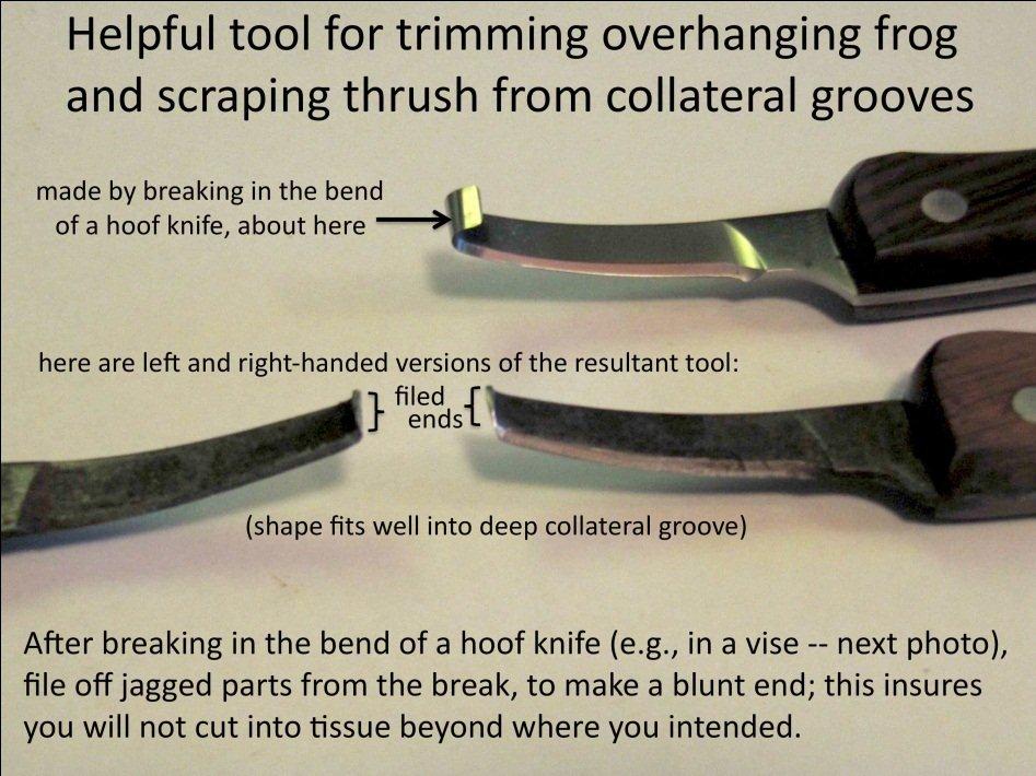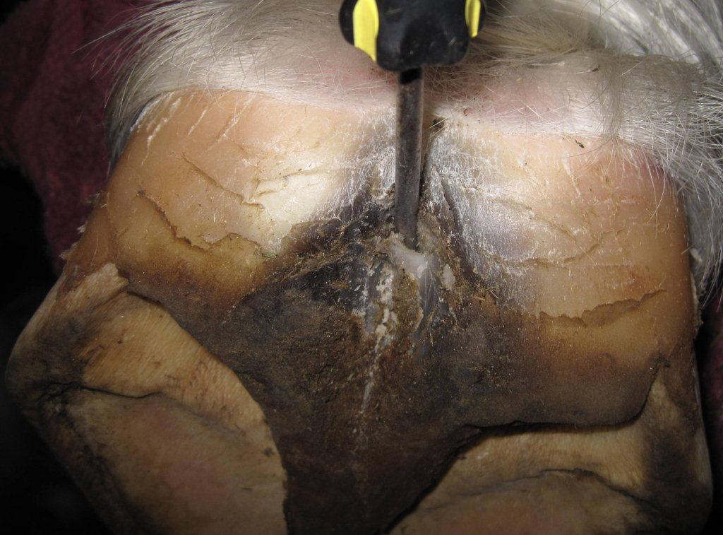 Good lighting is essential for thorough examination and trimming. Occasionally one stumbles upon problems by accident, but generally very methodical probing and painstaking cleaning of all the sulci, as well as thorough investigation of any soft and/or discolored areas is necessary to insure that all diseased portions are identified and treated. Proper tools are a necessity. These include sharp left and right handed hoof knives, preferable with a small curl. Diseased tissue can be difficult to cut as it tends to bend away from the knife, so sharp tools are needed for accurate and efficient removal. Loop knives may be helpful, but should be as narrow as possible. Care must be taken when using them not to inadvertently remove too much material from the bar walls of the collateral grooves. Double sided abscess knives work well for fine trimming. Dental probes, scaling tools, awls, small Phillips head screwdrivers, and the tiniest bone curettes are effective for accurately scraping away dirt or diseased tissue, esp. in horn cavities and deep in the collateral grooves. Dental offices often discard tools no longer suitable for their use, but are still very helpful for working on horse’s feet. We have heard that it is wrong to aggressively clean the depths of the collateral grooves. In our experience, only diseased grooves are sensitive, and in this case indeed care must be taken to avoid invading live tissue by accident. Healthy grooves cannot be hurt even through rigorous cleaning with pointed and fairly sharp objects. We routinely use an awl, a regular screwdriver on which we rounded the sharp edges, or a small Phillip’s head screwdriver that tends to lightly scour the sides of the collateral grooves without any problem at all. It is essential that as much dirt and compromised tissue as possible be removed to allow penetration of therapeutic agents as well as prevent the progression of disease.