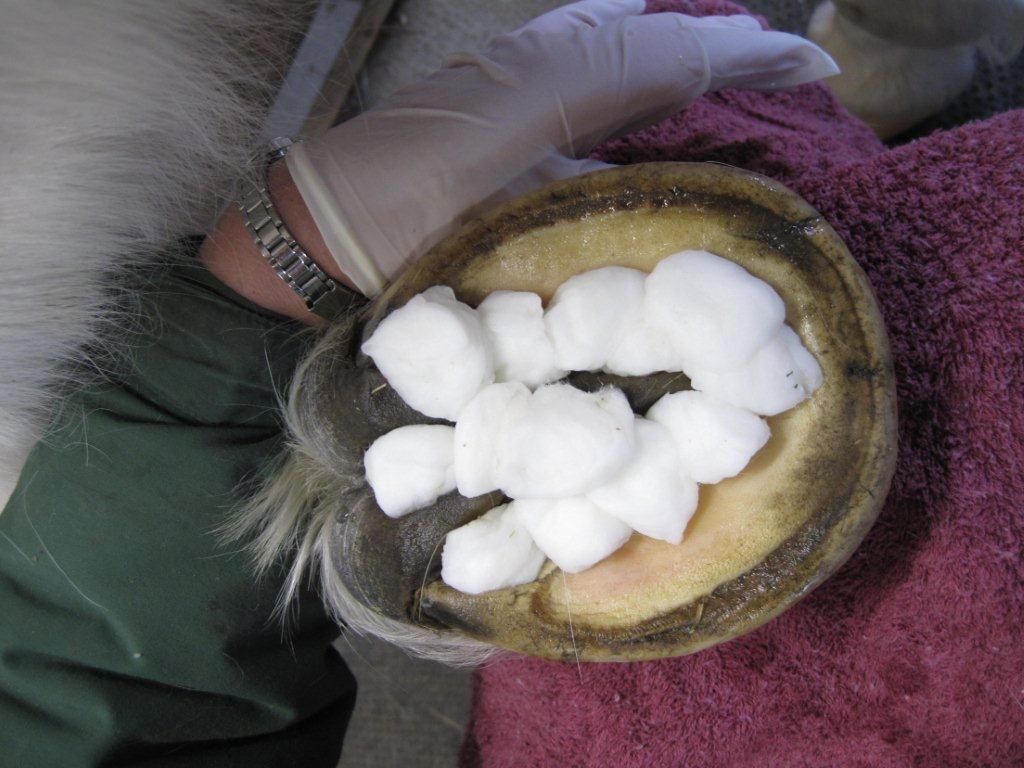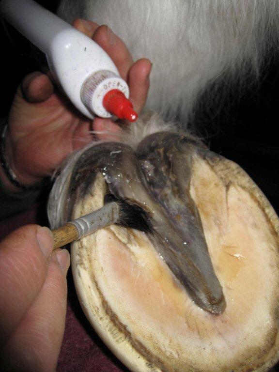 No single therapy works in every situation, nor is there one protocol for a given therapy that is always appropriate. Rarely does one bout of treatment permanently eliminate and prevent the recurrence of disease, particularly in stabled horses, those living in moist environments, and of course those with severe infection. Most often, frog infections are so pervasive and longstanding that it can take months for the diseased tissue to completely grow out, discouraging the hoof care provider into thinking that the treatment does not work. Remember that frog disease is really a syndrome and not a discrete disease entity. There are multiple causes (environment, conformation, trimming, shoeing, past disease, exercise level etc.) and agents (gram positive or negative bacteria, fungi, aerobic or anaerobic organisms and various combinations of these). Infections within a single foot may conceivably be of different origins and harbor different organisms. Efficacy of any given therapy will depend on these variables and also with the different immune capabilities of the individual horse. Daily thorough hoof cleaning must be done in good light (NOT in a dark stall) so that the depths of the collateral grooves and the central sulcus can be clearly seen. Routine treatment with hoof disinfectants may be an inevitable and permanent component of hoof care for those who want optimal foot health for their horses. In Europe, this is quite often standard but for some reason in the US (perhaps because of the dry conditions in the West becoming the model for the rest of the country) a casual swipe of the hoof pick to remove big chunks of manure is considered adequate maintenance. The prevalence of hoof problems that have their roots in frog disease suggests otherwise. Periodic soaks with chlorine dioxide agents such as White Lightning or Oxine are also often necessary to maintain healthy frogs. The frequency of disinfection and soaks depend on individual management circumstances, the susceptibility of the foot to infection because of prior disease, conformation and choice of therapeutic agent. Treatment can be divided into three categories: spot therapy of isolated defects, topical agents and soaking. In the last two categories, the whole foot may be treated or only the sole and frog. Of the countless products on the market, some agents may be used either way, while others are only designed for one or the other. One should always look for the least toxic, or better yet, non-toxic ingredients. Below is a list of some products that have been successful in treating frog disease, either in our experience or the experience of other horse owners.