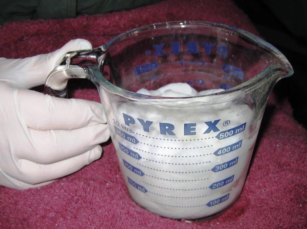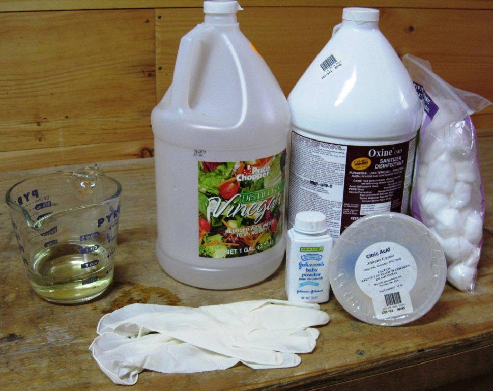 Washing the hooves with a good brush, with some dish soap if desired, or putting them in soaking boots for a while will achieve a clean hoof surface. Then drying the hoof with a clean towel with particular attention to deep crevices will facilitate viewing and debriding. If washing is not an option, removing any dirt and debris as well as possible and then pushing and pressing a clean towel into slits, crevices etc. can also work. Proper cleaning enables easy and effective trimming of the frog down to healthy material. Fig. 53 shows the materials required to start an Oxine Soak. These include citric acid or white vinegar, cotton balls, a measuring cup, latex gloves and baby powder. The Oxine can be activated either with vinegar or citric acid. Follow the label on the bottle. White vinegar is not mentioned on the Oxine bottle label, but can be used at an equal amount to the Oxine. The activation time is about 3 to 5 minutes, and turns the liquid yellowish. The cotton balls are for stuffing the collateral grooves so that very little liquid is being used and only the sole covered. We found that submerging the whole hoof dries it out too much. We also recommend using gloves as too much skin exposure also has a drying effect. The baby powder is for multiple uses of the gloves. Just a little dusting after taking them off helps to get them on and off again next time. We found that for average sized hooves about 1 cup of liquid is enough. We put enough cotton balls to absorb all the liquid.
