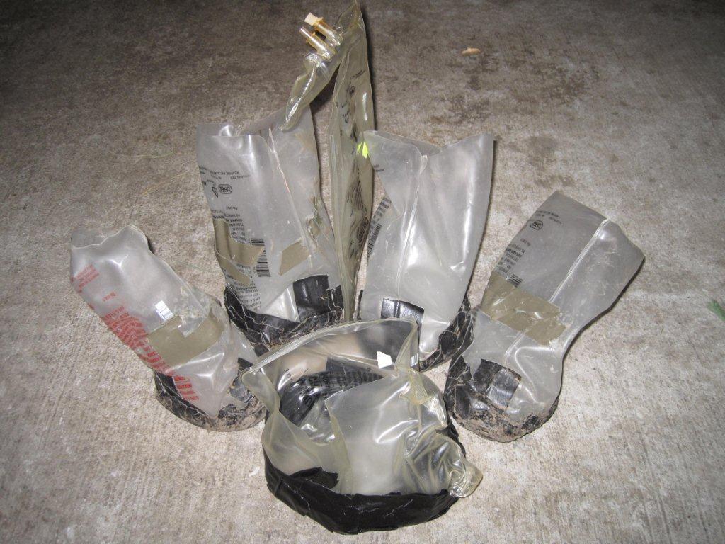 Fig. 54 shows how 3000 ml IV bags make excellent re-useable soaking boots for most horses. Using duct tape, we make boots out of them which allows for easy and on and off and we label them for each horse and foot. For the smaller hooves it is really easy, you just cut off the end with the valves and shape the boot with the hoof in your lap. For bigger hooves, it is a bit more complicated. You need to cut the long side open, and it is a bit trickier to shape the boot. But it still works.