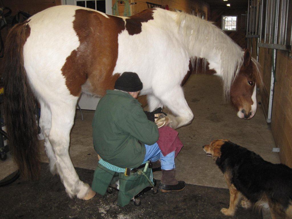 If at all possible, the horse should be trained to allow a person seated on a rolling mechanic's stool to work with the upturned hoof placed in a towel–draped lap (Fig. 37). This method greatly facilitates accurate and effective treatment; please make sure your horse is completely reliable when handled this way. We have easily and successfully taught this method to horses as old at seventeen years and as young as five months with no problems. It is not recommended to crosstie horses being worked on in this way. A second handler at the head is helpful for horses learning to accept this method and adds a degree of safety for the trimmer.