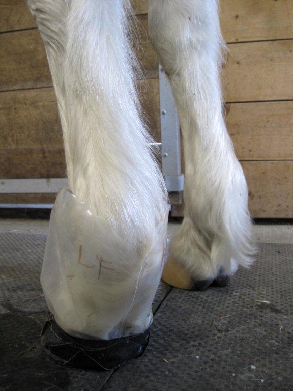 Fig. 57 shows the boot on the foot. Most horses readily accept the IV bags as soaking boots without a fuss. When making the boot it is important to make it snug, but not too tight so it can be put on easily again. In cold weather, one may need to warm it up with a heat gun or a hair dryer.