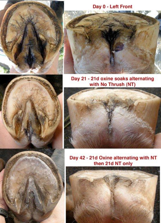 Josephine Trott, PhD, Assistant Project Scientist, Department of Animal Science at the University of California, Davis, has been experimenting with and documenting her treatment procedure which included several different agents, amongst others No Thrush and Oxine AH. Here is in her words what occurred: