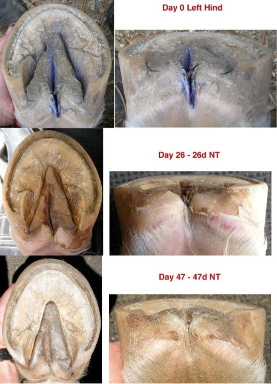 I had hoped that during the dry season/summer I would make more progress than I was over winter/mud season but I still felt like I was going 2 steps forward 2 steps backward. Then I stumbled upon No Thrush, thought it sounded good, so I bought a large bottle and started dusting. Five days later there were some signs of healing but no miracles so I started an experiment on eight hooves, comparing daily dusting with No Thrush to daily soaking in Oxine AH or a combination of the two. Three weeks later, the No Thrush treated frogs were not sensitive anymore, the heel bulbs were much firmer, the depth of the central sulcus was 50% shallower and the frog tissue was overall much firmer with no significant areas of surface thrush/cheesy frog. By comparison, the two Oxine AH soaked frogs were still sensitive to pressure, still had deep central sulci and significant surface thrush. The treatment protocols were as follows: 5 day No Thrush Treatment Four hooves on two horses (A and B) were treated every morning with No Thrush for 5 days, with two applications 10 hours apart on the first day only. The hooves were picked clean using a hoof pick, hoof knife, stiff bristle brush and a tooth scraper to remove all loose debris in the lateral sulci and central sulci. When necessary, cotton wool was inserted into the central sulci and a hoofpick used to scrape the cotton wool through the gap to further clean out dirt and manure. The central sulci were filled with No Thrush, the lateral sulci were dusted with No Thrush, along with any other areas of the frog that were decaying or had a white crumbling appearance. Photographs were taken the day before the first treatment (on Day 0) and on Day 6 (one day after the 5th day of treatment). 21 day No Thrush and Oxine AH comparison Four hooves on two horses (A and B) were included in the treatments. The two front hooves of Horse A were assigned to receive only Oxine AH soaks in Davis soaking boots. These soaks were performed daily for 7 days, then every second day for 14 days. The two front hooves of Horse B were assigned to receive both Oxine AH soaks in Clean Trax soaking boots and No Thrush treatment on alternate days. The four hind hooves of Horses A and B received daily No Thrush treatment only. All feet were picked clean twice daily with a hoof pick. Every morning, immediately prior to treatment, all hooves were scrubbed and washed with dish detergent and a stiff bristled brush until the foam was white or nearly white. Hooves to be treated with Oxine AH received cotton wool inserted into any central sulci large enough to hold the cotton wool and were then placed into soaking boots. Oxine AH was activated using 1/2 tsp citric acid per 60 ml Oxine AH, mixed and allowed to sit for at least 3 minutes, then diluted with 1L of deionized water. Oxine AH soaks lasted 20-30 min. During this time, the No Thrush treated hooves were allowed to air dry and then further cleaned of any minor debris before application of No Thrush as described above. Following an Oxine AH soak, hooves were either left to dry (Horse B) or were towel dried and 40% zinc oxide cream was applied, and dry cotton wool was inserted into the central sulci (Horse A). Photographs were taken on Day 1 (the start of the soaking treatments and equivalent to Day 6 above), Day 8, Day 15 and Day 22. Fig. 59 Left front hoof of Horse B treated with alternating Oxine AH soaks and No Thrush for 21 days following 5 days of No Thrush.